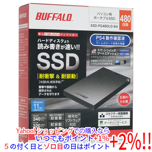 【商品名:】BUFFALO 外付けSSD SSD-PG480U3-BA 480GB ブラック / 【商品状態:】新品です。 / 【検索用キーワード:】≪バッファロー≫ SSD-PG480U3-BA [ブラック] / 【型番:】 SSD-PG480U3-BA [ブラック] / 【商品説明:】耐振動・耐衝撃に対応したUSB 3.1 Gen1ポータブルSSD /