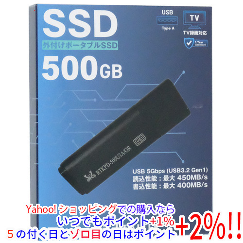 【商品名:】Realtek スティック型 USB接続 外付けSSD RTKPD-500U3A/GR 500GB / 【商品状態:】新品 / 【検索用キーワード:】≪即納≫ RTKPD-500U3A/GR / 【型番:】 RTKPD-500U3A/GR / 【仕様:】[スペック]/ 容量 500 GB/ インターフェイス USB/ 設置タイプ 外付け(ポータブル)/ / [パフォーマンス]/ 読込速度 450 MB/s/ 書込速度 400 MB/s /