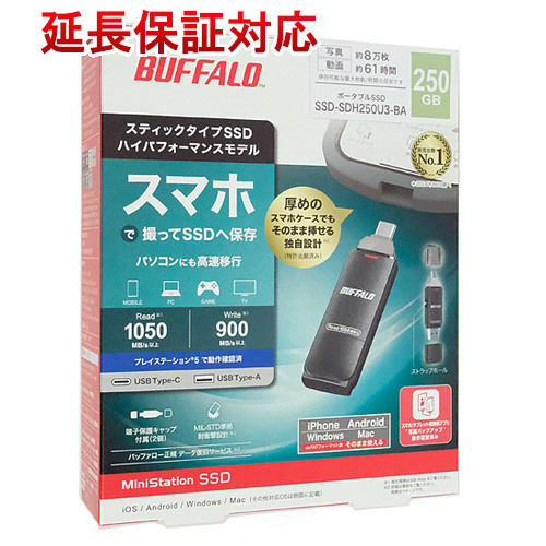 【商品名:】BUFFALO スティック型SSD SSD-SDH250U3-BA 250GB ブラック / 【商品状態:】新品 / 【検索用キーワード:】≪バッファロー≫ SSD-SDH250U3-BA [ブラック] / 【型番:】 SSD-SDH250U3-BA [ブラック] / 【商品説明:】スマホの写真・動画を簡単に保存できるスティック型SSD /