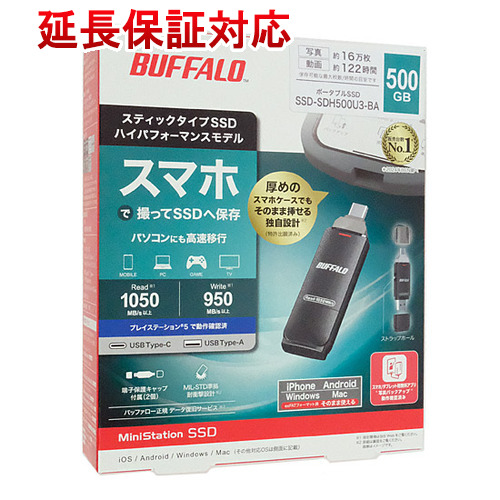 【商品名:】BUFFALO スティック型SSD SSD-SDH500U3-BA ブラック / 【商品状態:】新品 / 【検索用キーワード:】≪バッファロー≫ SSD-SDH500U3-BA [ブラック] / 【型番:】 SSD-SDH500U3-BA [ブラック] / 【商品説明:】スマホの写真・動画を簡単に保存できるスティック型SSD /