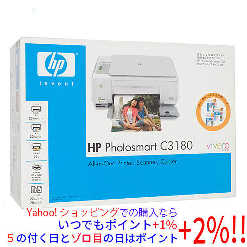 【商品名:】HP製 Photosmart C3180 All-in-One / 【商品状態:】新品。 / 【検索用キーワード:】≪プリンタ 即納≫ HP Photosmart C3180 All-in-One / 【型番:】 C3180 All-in-One / 【仕様:】[基本スペック]/ タイプ インクジェット/ 解像度 4800x1200 dpi/ インク形状 一体/ インク色数 4 色/ / [給紙]/ 最大用紙サイズ A4/ 最大給紙枚数(普通紙) 100 枚/ / [詳細スペック]/ 機能 コピー/スキャナ/ 接続インターフェイス USB/USB2.0/ その他機能 ダイレクト印刷/カードリーダー/フチなし印刷/ / [サイズ・重量]/ 幅x高さx奥行き 434x162x290 mm/ 重さ 5.1 kg /