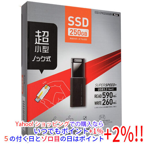 【商品名:】【新品訳あり(箱きず・やぶれ)】 ELECOM 外付けポータブルSSD ESD-EPK0250GBK ブラック 250GB / 【商品状態:】新品の商品です。/外箱に破れや潰れ、汚れなどのダメージがあります。/(訳あり理由)/※外箱のダメージのみで、商品自体には影響ございません。 / 【検索用キーワード:】≪即納≫ ESD-EPK0250GBK [ブラック] / 【型番:】ESD-EPK0250GBK [ブラック] / 【商品説明:】片手でワンプッシュのラクラク接続!ノックで出して自動で収納できる、USBメモリサイズの超小型で読み出し最大590MB/sの高速データ転送を実現するUSB3.2(Gen2)外付けポータブルSSD。 /