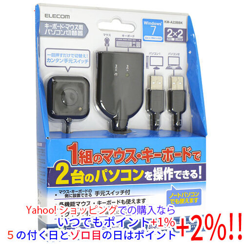 【商品名:】ELECOM製 パソコン切替器(2切替) KM-A22BBK / 【商品状態:】新品。 / 【検索用キーワード:】≪エレコム KVM CPU切替器≫ KM-A22BBK / 【型番:】KM-A22BBK / 【商品説明:】●1組のキーボード、マウスなどのUSB機器を2台のPCで切り替えて使える/ / 1セットのキーボード、マウスなどのUSB機器を2台のパソコンで切り替えて使用できます。パソコンが2台あってもマウス・キーボードが1セットで済み、省コスト・省スペースを実現します。シンプルでコンパクトなケーブル一体型タイプですっきりと設置でき、ケーブルを紛失する心配もありません。/ デスクトップパソコンでもノートパソコンでも切替え可能で、WindowsPCとMacintoshとの切替えも行えます。 /