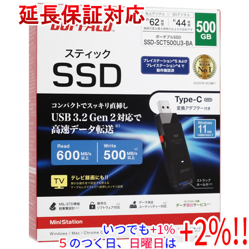 | BUFFALO スティック型外付けSSD SSD-SCT500U3-BA 500GB ブラック | |