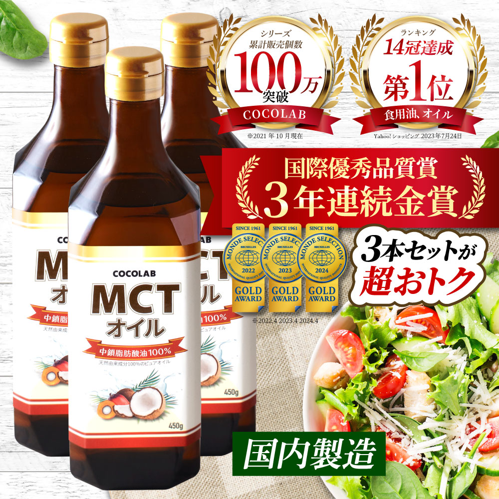 | おすすめの摂取方法 | 無味無臭なので色々な料理や飲み物に混ぜて摂取できます。おすすめの摂取方法としてはコーヒー・豆乳・サラダ・味噌汁・ヨーグルトなどに入れていただくことです。某ベストセラー書籍では オーガニックコーヒー にMCTオイルと グラスフェッドバター ( 無塩バター )を混ぜて使った 完全無欠コーヒー ( 完全無欠珈琲 )が話題になりました。 |