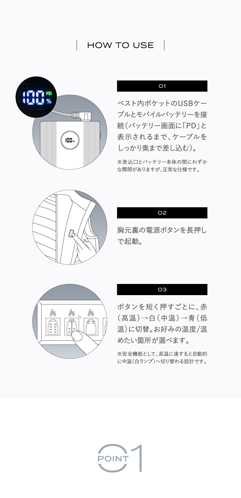 USB接続→電源ボタン長押しで起動→ボタン短押しで温度切替。