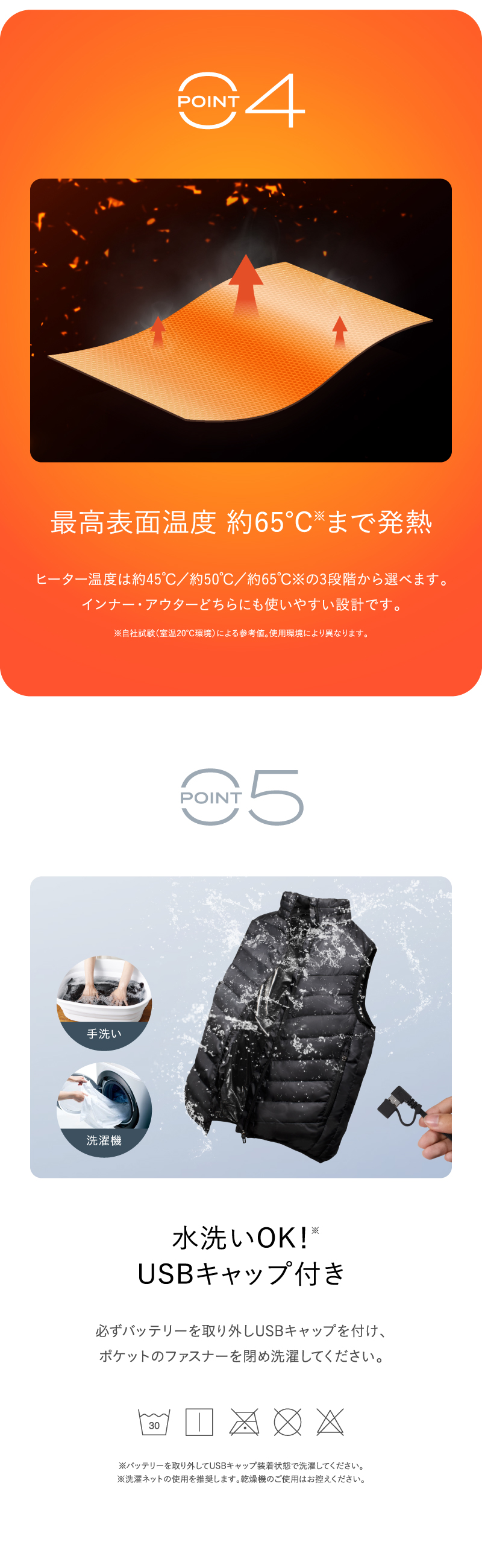 【洗濯可能】ヒーター付きベストは洗濯可能です。※必ずモバイルバッテリーを取り外して、USBキャップを閉めてから洗濯してください。