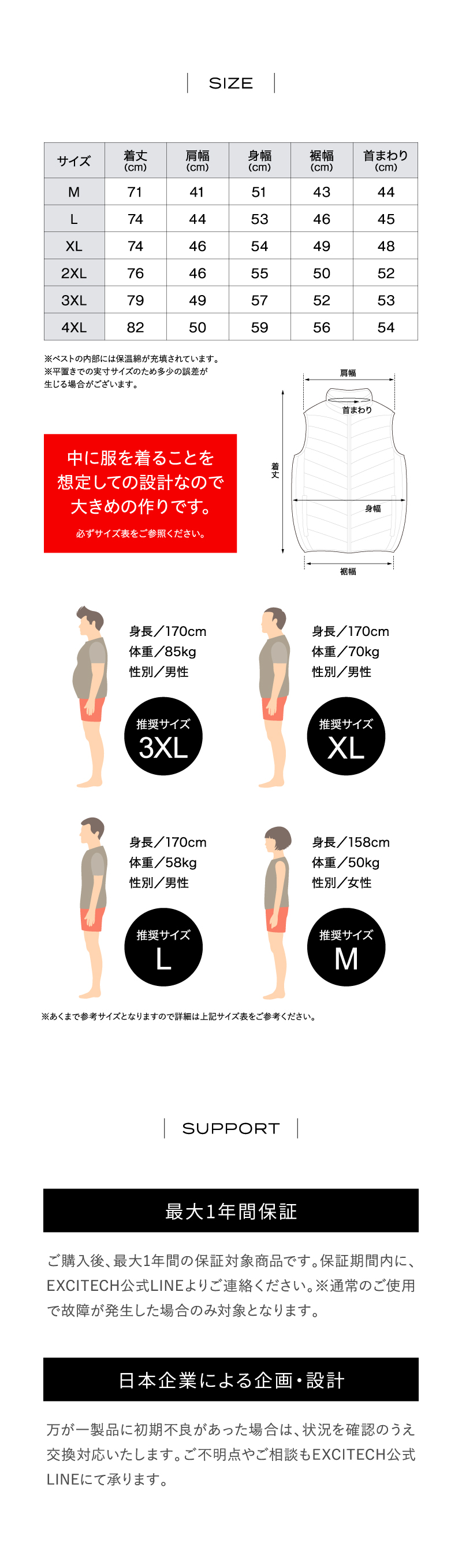 (保証期間内でもExcitech Heat Vestに対応していないバッテリーを接続したことによる故障は保証対象外となります。)