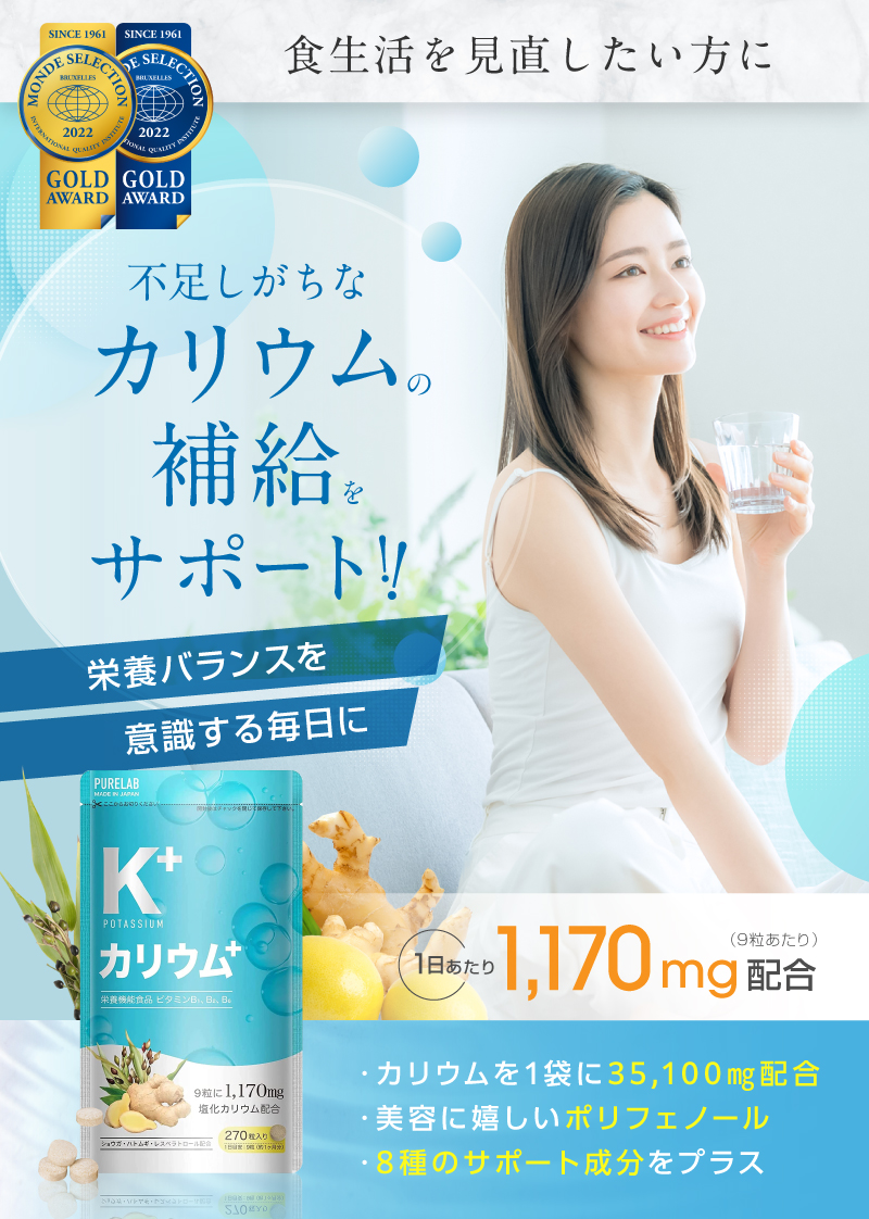 カリウム サプリ 塩化カリウム 1170mg (モンドセレクション金賞受賞) カリウムサプリ 栄養機能食品ビタミンB1 B2 B6 ダイエット クエン酸 国内製造 PURELAB