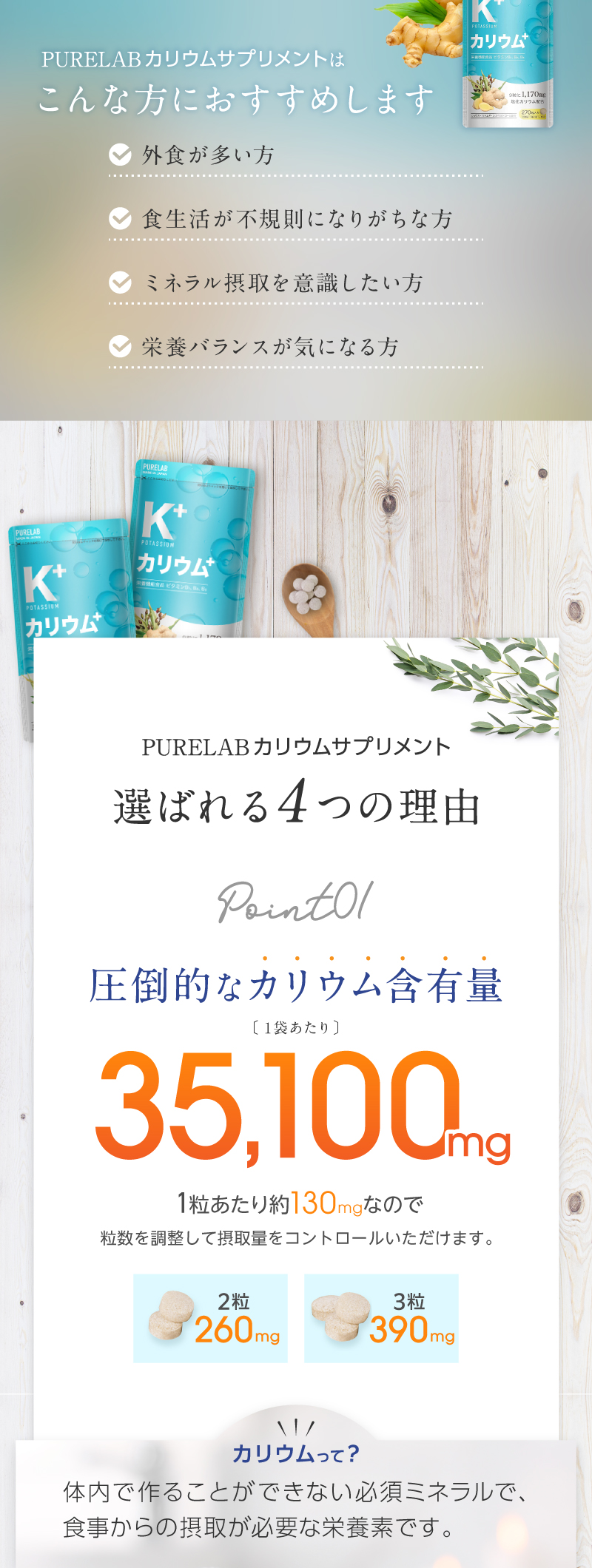 PURELABカリウムサプリメントは、1日目安量あたりカリウム(塩化カリウム)1170mg、1袋あたり35,100mgを摂取できるよう設計されています。