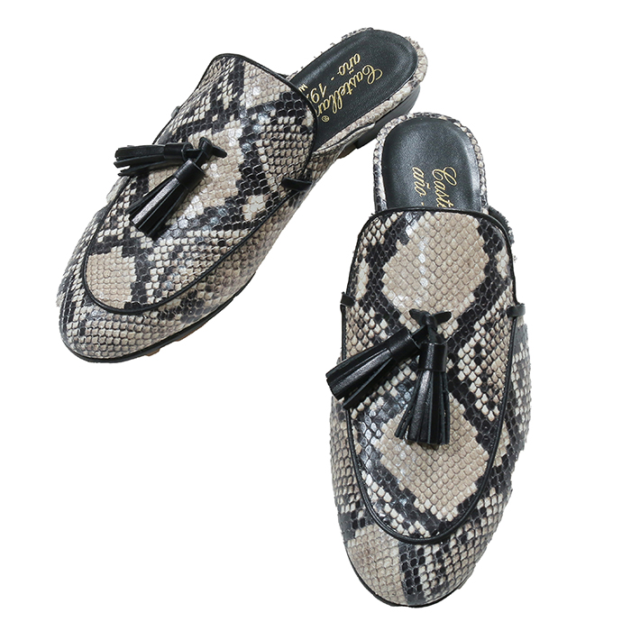 | アイテムの特徴 | 派手なイメージの強いパイソン柄ですが、スリッポンなら抜け感が生まれ、きれいめのスタイリングにもしっくりハマります。 歩くたびに揺れるタッセルもオシャレさをプラスしてくれます。 |