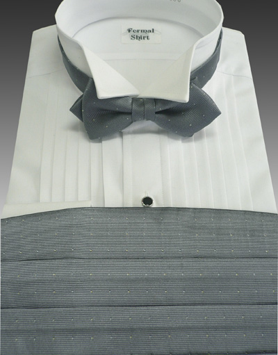 グレーのドット柄でフォーマルな装いに最適の蝶ネクタイ、カマーバンドのセット。