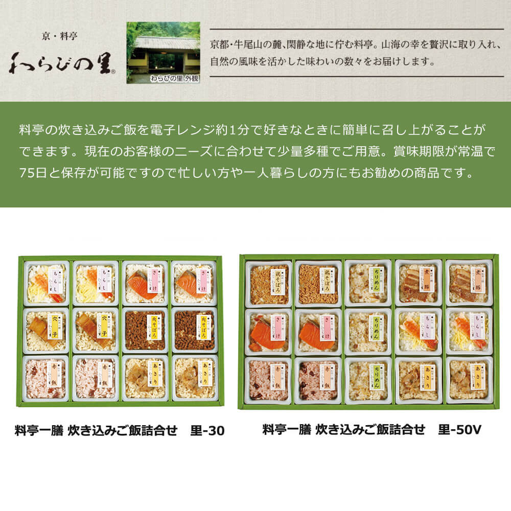 京都・洛東の料亭「わらびの里」の味をご家庭で手軽に味わえる、炊き込みご飯の贅沢な詰合せです。