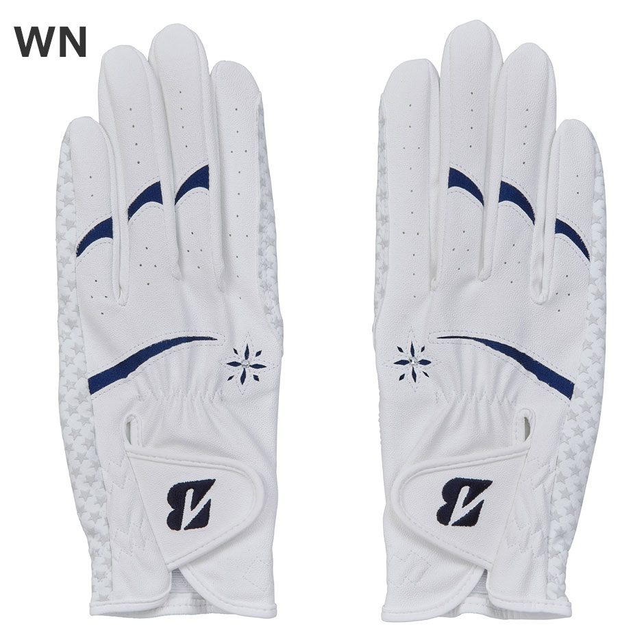 手のひら側に星柄シリコーンプリントを施し、密着性を高めることでスイング時のグローブとクラブのグリップ部のズレを抑制します。甲側には花柄モチーフ部にラインストーンを施し、手元に華やかさをプラス。同デザインの片手用(GL25L1)もご用意しています。