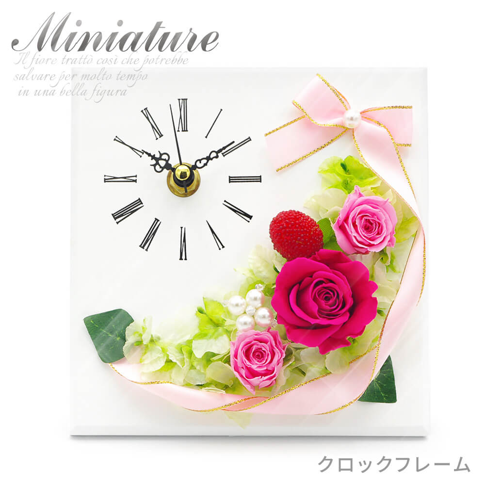 ピンク系のバラと明るいグリーンがかわいらしくアレンジされた、時計付きプリフラットフレームです。 パールや苺のパーツ、サテンのリボンが可憐な雰囲気を与えてくれます。幸せな時を刻む結婚式や誕生日お祝いの祝電ギフトにオススメです。