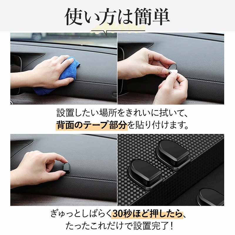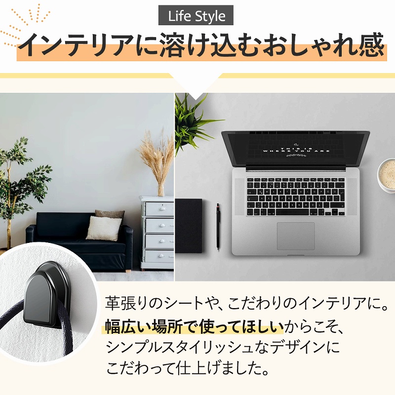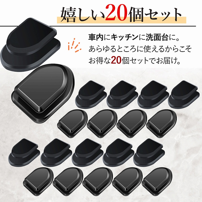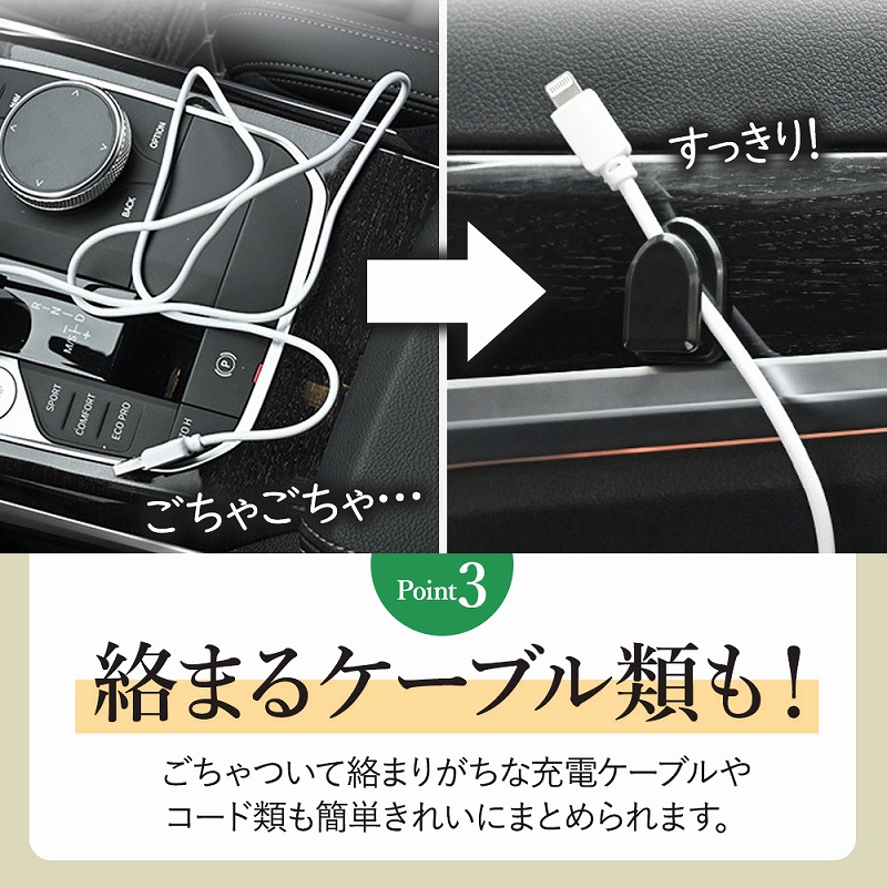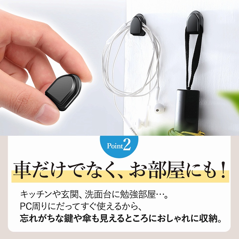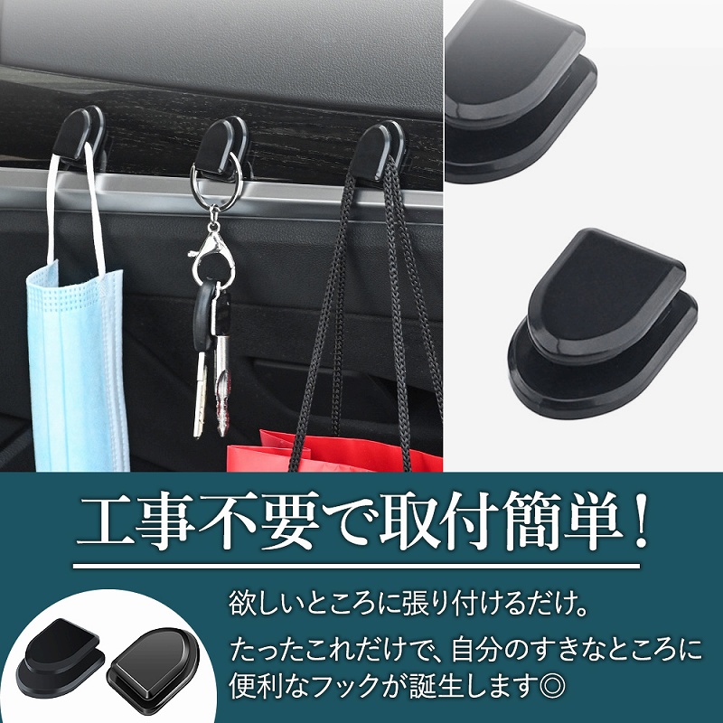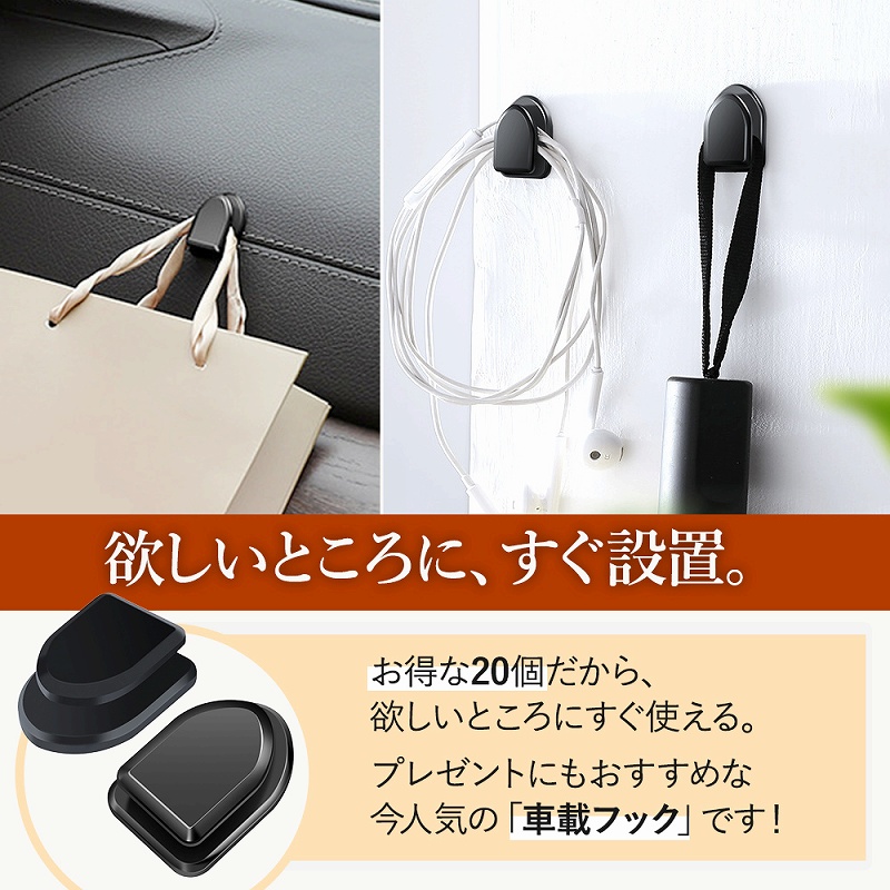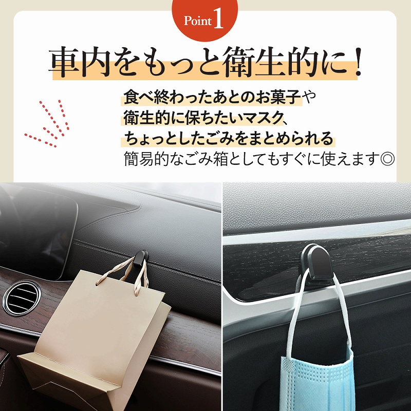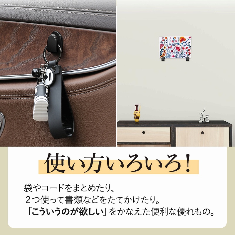 | 工事不要で取付簡単! 欲しいところに張り付けるだけ。 たったこれだけで、自分のすきなところに便利なフックが誕生します◎ 食べ終わったあとのお菓子や衛生的に保ちたいマスク、 ちょっとしたごみをまとめられる簡易的なごみ箱としてもすぐに使えます◎ 車だけでなく、お部屋にも! キッチンや玄関、洗面台に勉強部屋…。 PC周りにだってすぐ使えるから、忘れがちな鍵や傘も見えるところにおしゃれに収納。 絡まるケーブル類も! ごちゃついて絡まりがちな充電ケーブルやコードも簡単きれいにまとめられます。 設置したい場所をきれいに拭いて、背面のテープ部分を貼り付けます。 ぎゅっとしばらく30秒ほど押したら、たったこれだけで設置完了! 穴をあけない優秀仕様だから、いろんなシーンで大活躍。 あらゆるところに使えるからこそお得な20個セットでお届け! 革張りのシートや、こだわりのインテリアに。 幅広い場所で使ってほしいからこそ、シンプルスタイリッシュなデザインにこだわって仕上げました。 |