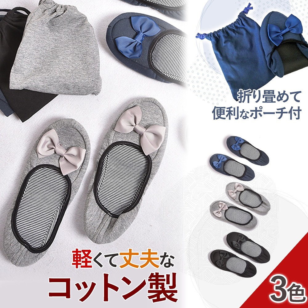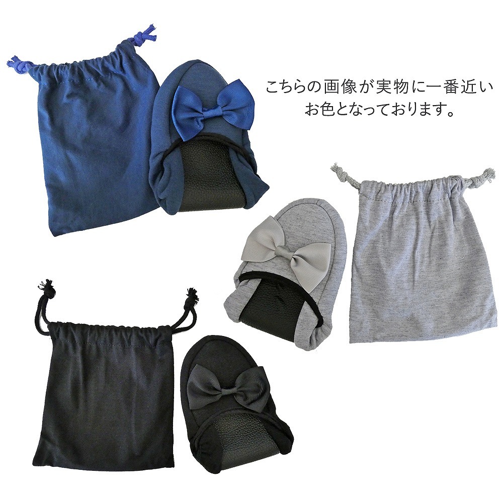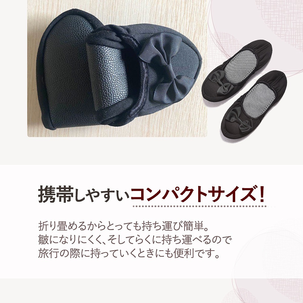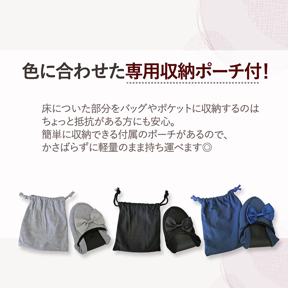 | 主な仕様 | コンパクトに持ち運べるラクラク仕様。 折りたたむと、簡単に小さくまとまるのでバッグにもさっと収納することが可能です。 専用ポーチをお付けしますので、衛生的にも安心。 光沢感のあるリボンがかわいらしいながらも、清楚で控えめな印象のある大人のルームシューズなので、入学式や授業参観はもちろん、オフィスや新幹線、飛行機の中でも使う事ができます。 収縮性の高いゴムで着脱がしやすく、ぱたぱたと音をたてないフィット仕様なので快適な履き心地を実現しました。 滑りやすい、つるつるとしたフローリングでも安心! 底はレザーなので滑りにくく、忙しいシーンでも心配なくお使いいただけます。 肌に直接当たるものだからこそ、肌触りの良い柔らか素材! ストレスを感じさせること無く、歩行を快適にしてくれます。 【カラー】 ブラック ネイビー グレー |