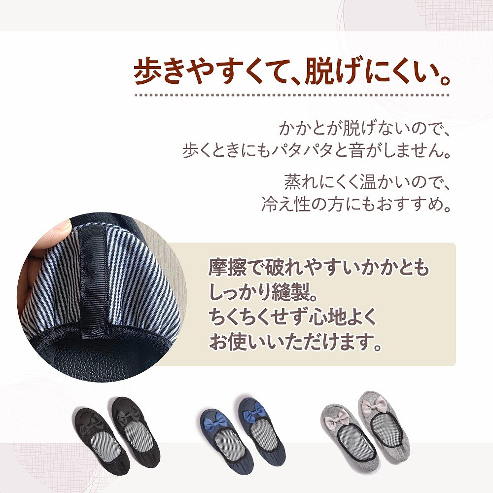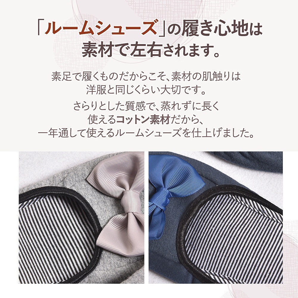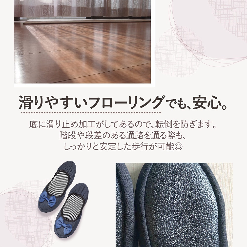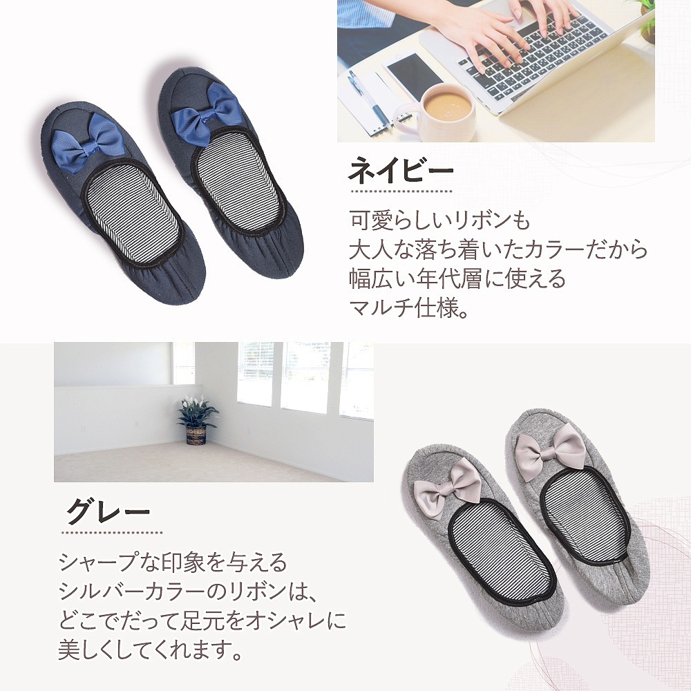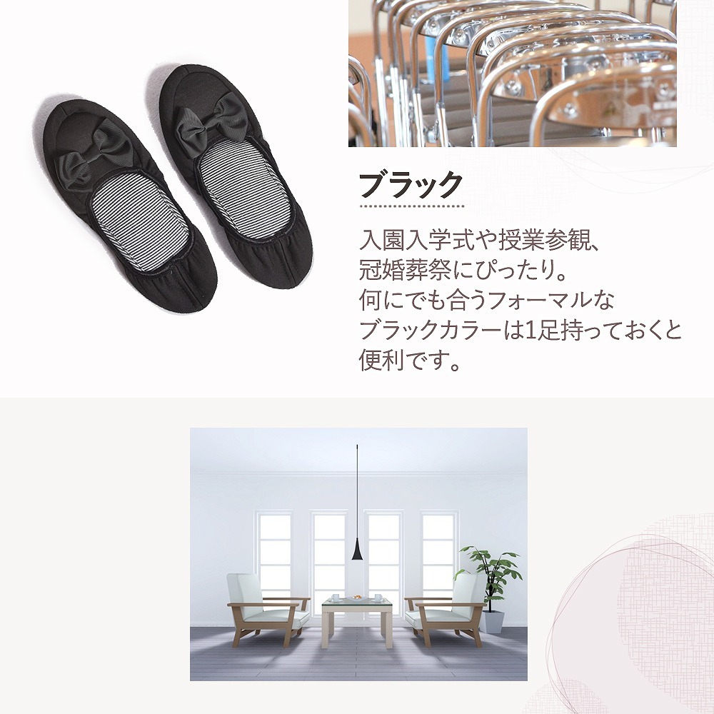| 主な仕様 | コンパクトに持ち運べるラクラク仕様。 折りたたむと、簡単に小さくまとまるのでバッグにもさっと収納することが可能です。 専用ポーチをお付けしますので、衛生的にも安心。 光沢感のあるリボンがかわいらしいながらも、清楚で控えめな印象のある大人のルームシューズなので、入学式や授業参観はもちろん、オフィスや新幹線、飛行機の中でも使う事ができます。 収縮性の高いゴムで着脱がしやすく、ぱたぱたと音をたてないフィット仕様なので快適な履き心地を実現しました。 滑りやすい、つるつるとしたフローリングでも安心! 底はレザーなので滑りにくく、忙しいシーンでも心配なくお使いいただけます。 肌に直接当たるものだからこそ、肌触りの良い柔らか素材! ストレスを感じさせること無く、歩行を快適にしてくれます。 【カラー】 ブラック ネイビー グレー |