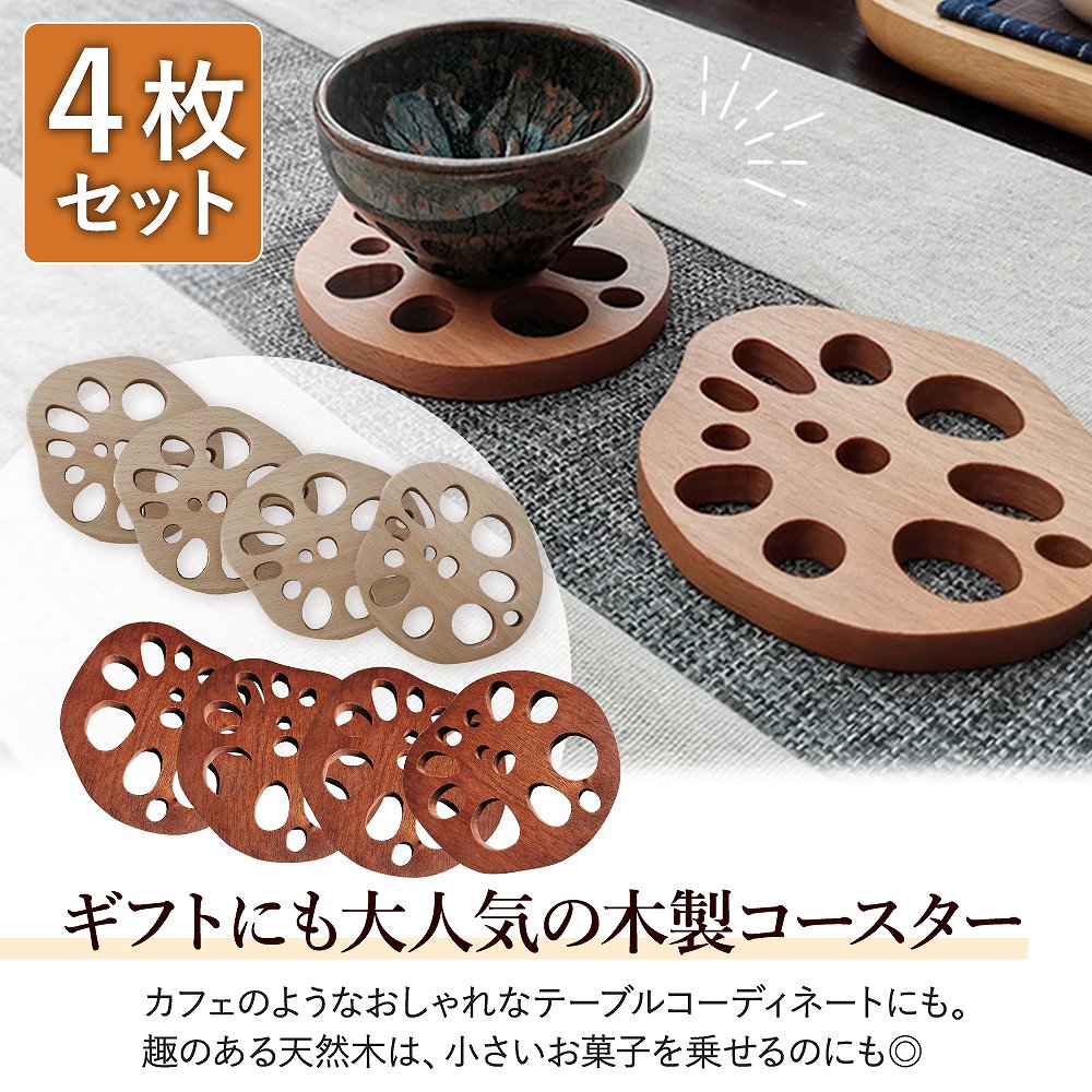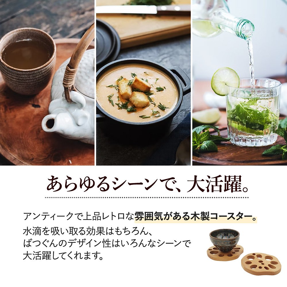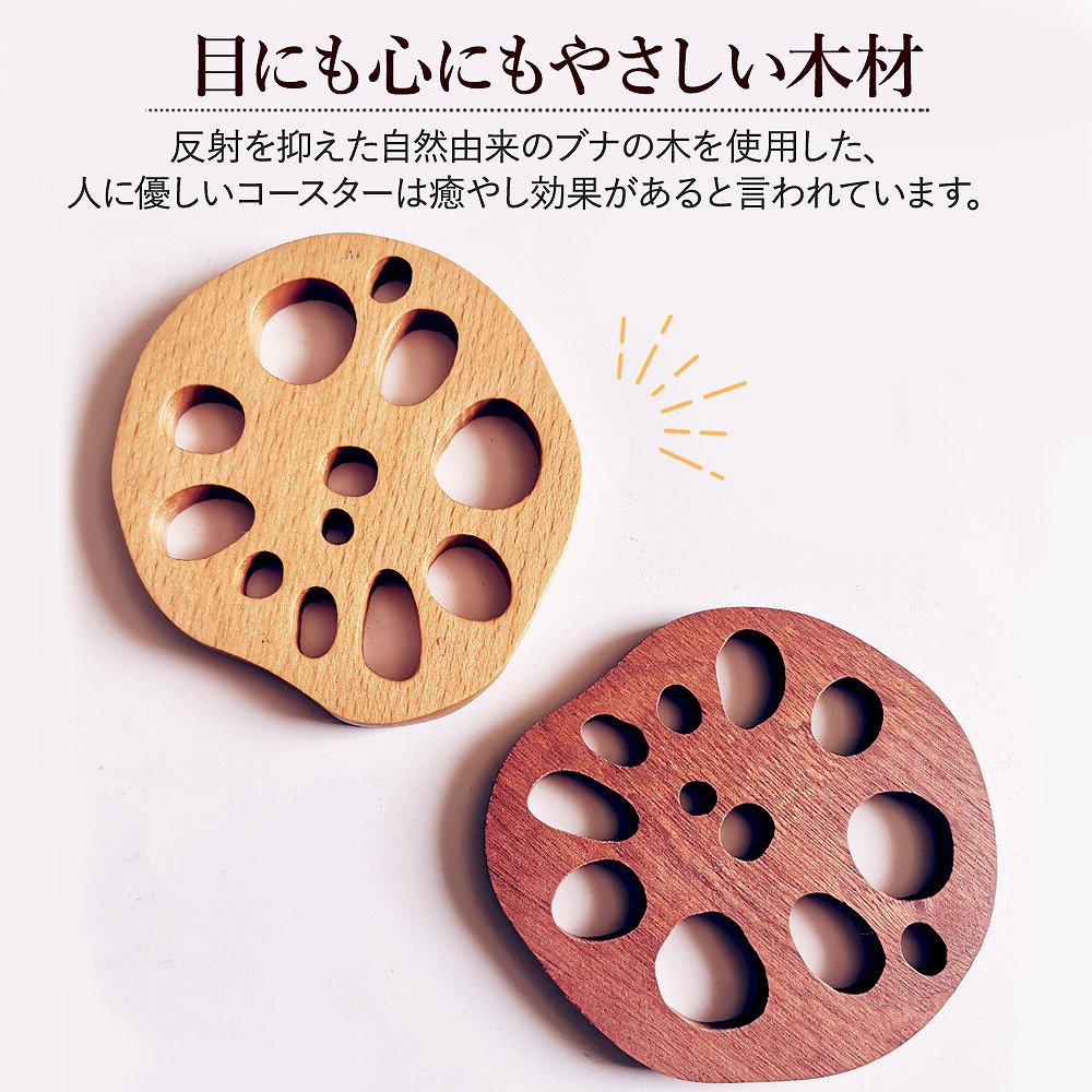 | 上質な風合いに触れる豊かさ。 木製なので、落としても割れづらく丈夫! 触ると木の豊かさを楽しめる、自然であたたかみのあるデザインは毎日の食事や生活をより豊かに◎ 縁起が良い、れんこん。 れんこんは、複数の穴が空いているので「将来の見通しがいい」と縁起を担いでいます。 おせちにも選ばれるほど、日本人の感性に寄り添ってくれるので、食卓にもよく合います。 あらゆるシーンで、大活躍。 アンティークで上品レトロな雰囲気がある木製コースター。 水滴を吸い取る効果はもちろん、ばつぐんのデザイン性はいろんなシーンで大活躍してくれます。 いろんな用途に使える、お得な4個セット家族で使ったり、来客用としてもバツグンに使えるお得な4個セット。 飲み物食べ物だけでなく、花瓶や小物の転倒防止としてもおつかいいただけます◎ |