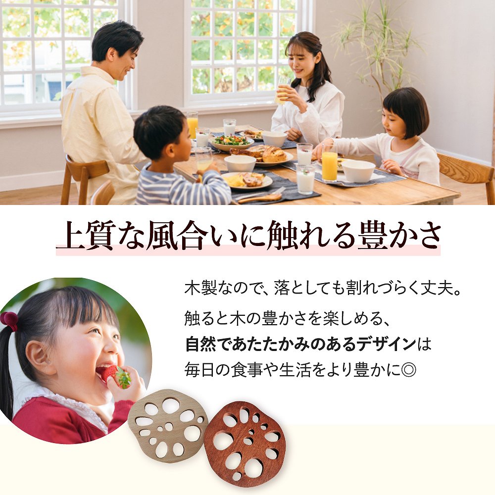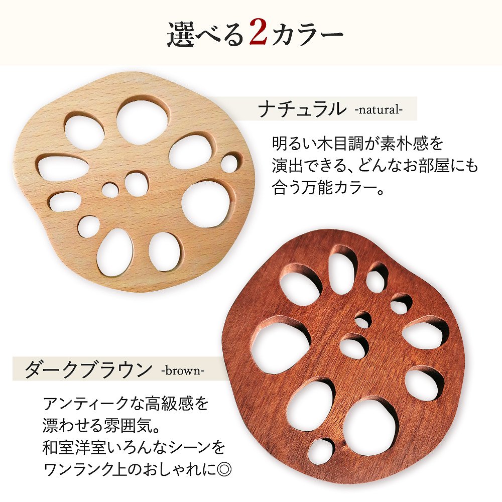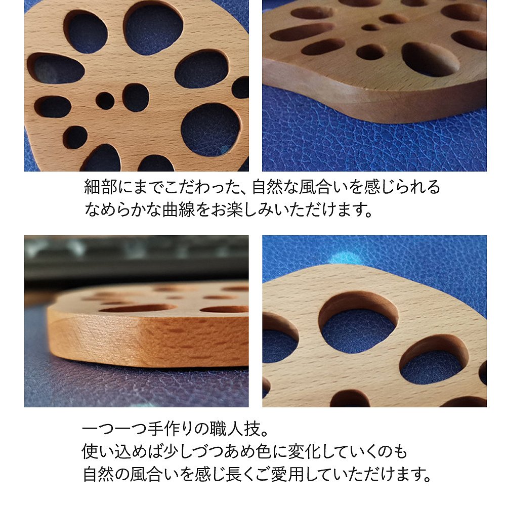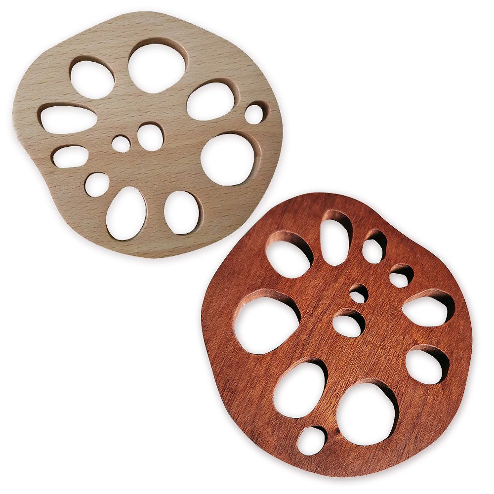 | 上質な風合いに触れる豊かさ。 木製なので、落としても割れづらく丈夫! 触ると木の豊かさを楽しめる、自然であたたかみのあるデザインは毎日の食事や生活をより豊かに◎ 縁起が良い、れんこん。 れんこんは、複数の穴が空いているので「将来の見通しがいい」と縁起を担いでいます。 おせちにも選ばれるほど、日本人の感性に寄り添ってくれるので、食卓にもよく合います。 あらゆるシーンで、大活躍。 アンティークで上品レトロな雰囲気がある木製コースター。 水滴を吸い取る効果はもちろん、ばつぐんのデザイン性はいろんなシーンで大活躍してくれます。 いろんな用途に使える、お得な4個セット家族で使ったり、来客用としてもバツグンに使えるお得な4個セット。 飲み物食べ物だけでなく、花瓶や小物の転倒防止としてもおつかいいただけます◎ |