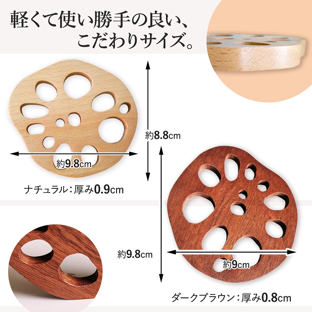 | 【サイズ】 ナチュラル: 約8.8cm×約9.8cm 厚み:約0.9cm ダークブラウン: 約9.8cm×約9cm 厚み:約0.8cm 重量:約30g 【カラー】 ナチュラル ダークブラウン 【素材】 天然木製(ブナの木) 【仕様】 同色4枚セット |