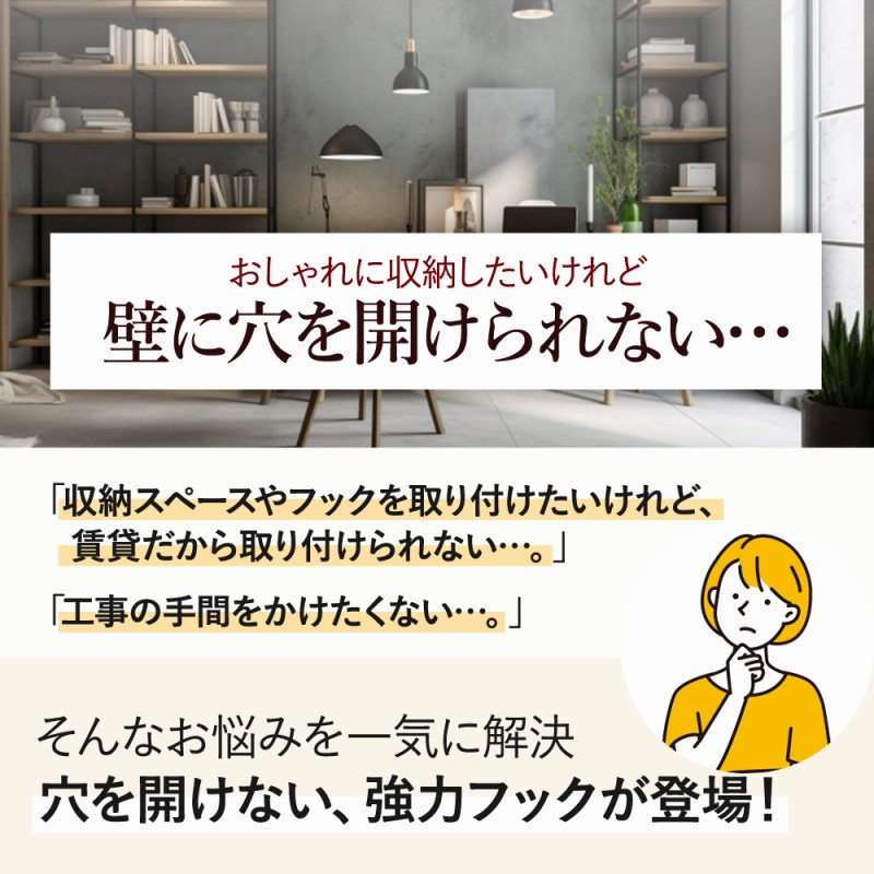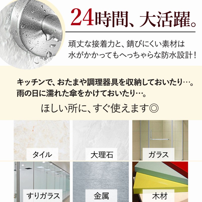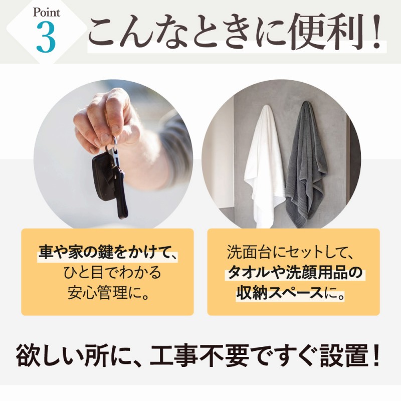 | 欲しい所に、好きなだけ。 お風呂場、キッチン、玄関など貴方の好みにあわせて カスタムできる手軽な「粘着フック」! どんな場所でも、よく馴染むデザイン。 使いやすさとシンプルさを兼ね備えた和室洋室どんなお部屋にも ぴったり合うおしゃれさと使いやすさにこだわりました。 丈夫な耐荷重! 約5kgの荷物に耐えられる超強力の接合力をもつテープを使用しているので、 まるでネジを締めたかのようにしっかりと固定。 こんなときに便利! 玄関において、車や家の鍵をまとめて人目でわかる安心管理に 洗面台にセットして、タオルや洗顔用品の収納スペースとしても◎ さらに…こんなことも出来ちゃいます。 約5kgの丈夫な耐荷重なので、上着をかけるハンガーラックとしても 大活躍! お得な4コセットでお届けなので、おうちのあちこちで使えます。 防水 壁 傷つけない オシャレ 粘着 タオルフック キッチン オフィス 浴室 |