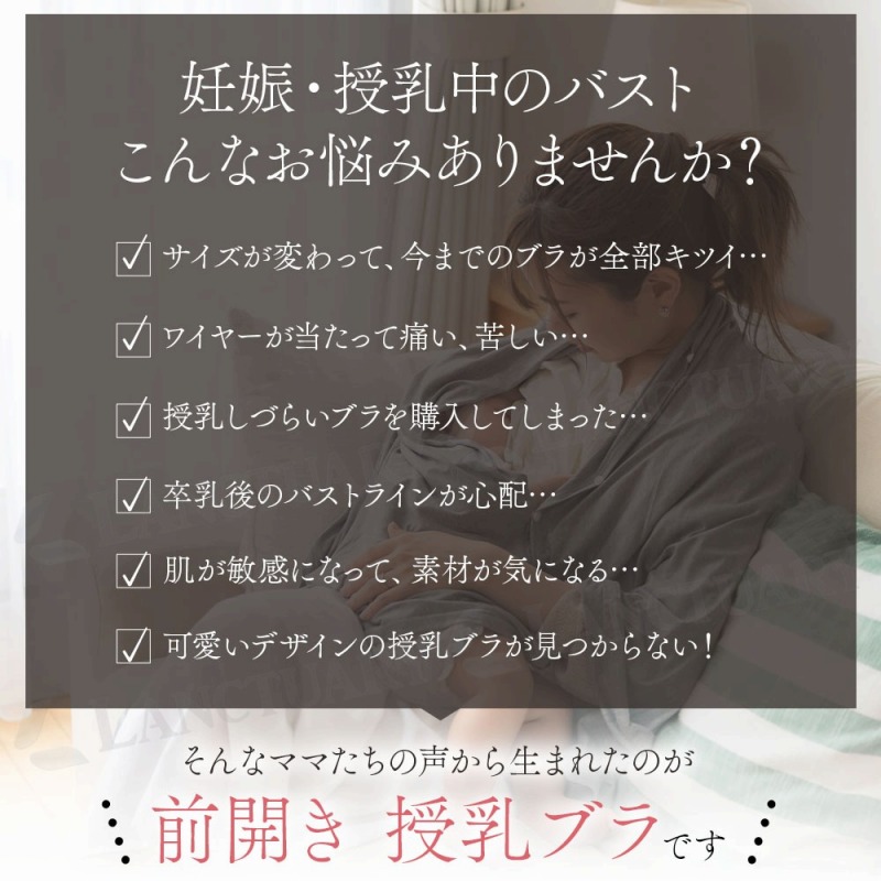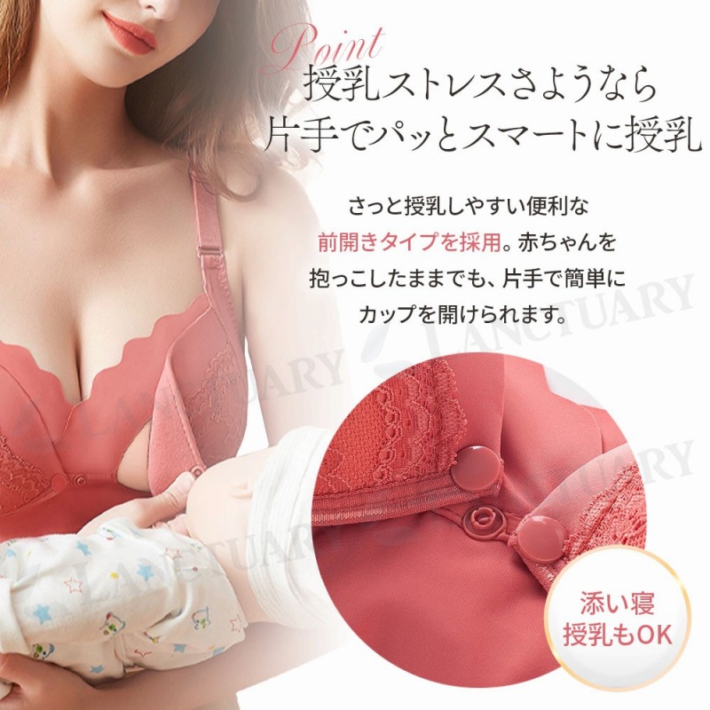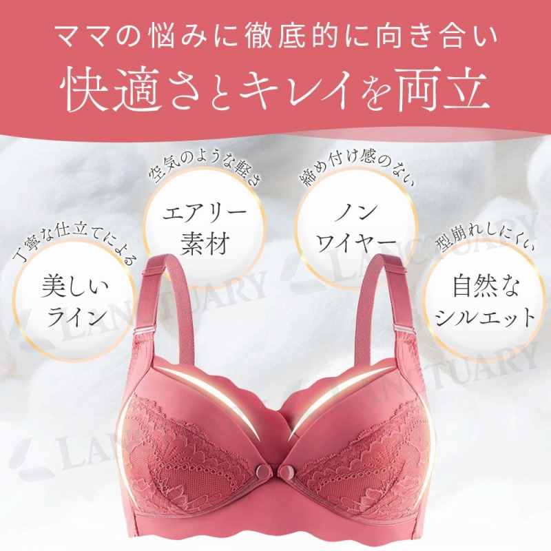 | 妊娠や授乳によるバストの変化、戸惑うこともありますよね。サイズが変わったり、締め付けが気になったり、授乳が大変だったり。そんなママたちの声に応えるのが、この授乳ブラです。 一番の特徴は、変化する体型にフィットすること。アンダーは4段4列ホックで調整できるので、妊娠初期から卒乳後まで、その時の自分に合ったサイズで快適に過ごせます。長く使えるのは嬉しいポイントです。 授乳のしやすさも考えました。前開きタイプなので、赤ちゃんを抱っこしたままでも片手でさっと開閉できます。夜中の授乳や、体が辛い産後すぐの時期にも本当に便利です。 ノンワイヤーでも、しっかりバストを支えます。脇高設計で横流れを防ぎ、幅広のアンダーゴムが下からサポート。楽な着け心地なのに、きれいなバストラインを保ちやすい設計です。ナイトブラとしてもお使いいただけます。 デリケートな肌のために、裏地は綿100%。ふんわり柔らかく、通気性も良いので快適さが続きます。肩にくい込みにくい幅広ストラップなど、細かな部分にも優しさを込めました。 機能だけでなく、レースを使った可愛いデザインも魅力です。毎日身に着けるものだから、気分が上がるものを選びたいですよね。 忙しいママの毎日を、もっと快適に、もっと心地よく。この授乳ブラが、あなたの頼れる一枚になりますように。 |