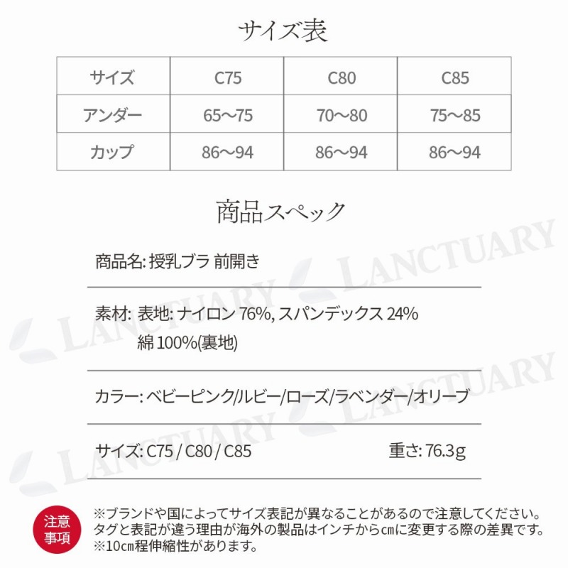 | 商品名: 授乳ブラ 前開き 素材: 表地: ナイロン 76%, スパンデックス 24% / 裏地: 綿 100% カラー: ベビーピンク / ルビー / ローズ / ラベンダー / オリーブ (全5色) サイズ: C75 / C80 / C85 C75 (アンダー65-75cm / カップ目安86-94cm) C80 (アンダー70-80cm / カップ目安86-94cm) C85 (アンダー75-85cm / カップ目安86-94cm) (※約10cm程度の伸縮性があります) |