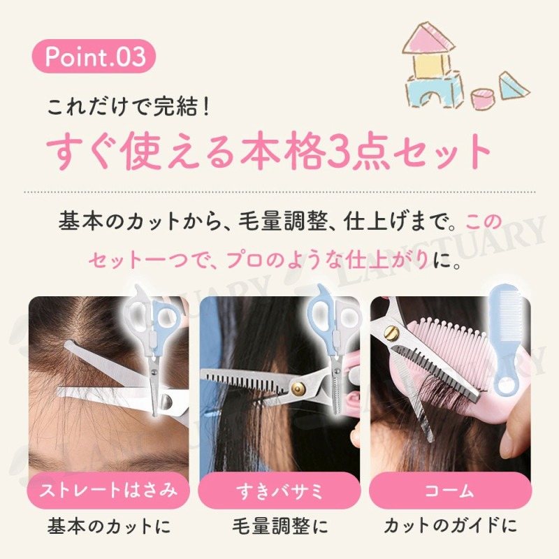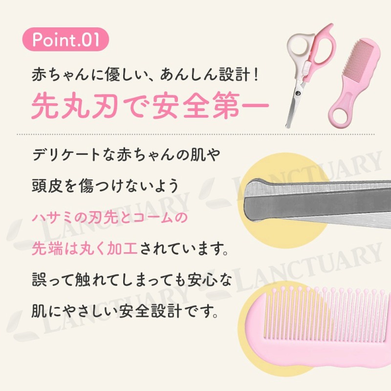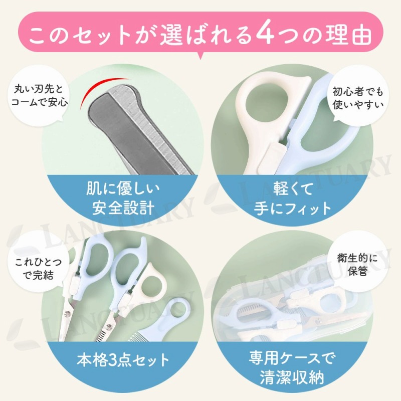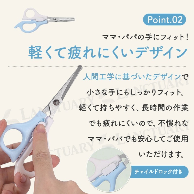 | お子さまの髪を切るたびに、美容室でのじっとできないや泣き出しちゃうに悩んでいませんか?ベビーヘアカットセットは、そんなママやパパの悩みを解決するために開発された、ご家庭で安心・安全に使えるヘアケアツールです。デリケートな赤ちゃんの肌や頭皮を傷つけないよう、ハサミの刃先もコームの先端もすべて丸く加工されています。誤って触れてしまっても安心な優しい安全設計が特徴です。 人間工学に基づいたデザインで、パパやママの小さな手にもしっかりフィットし、軽量で持ちやすいため、長時間の作業でも疲れにくい設計です。初めてのセルフカットでも安心してご使用いただけます。基本のカット用ストレートはさみ、毛量調整用のすきバサミ、そして髪を整えるコームの本格3点セットなので、これ一つでカットから仕上げまでプロのような仕上がりが目指せます。さらに、すべてのアイテムがすっきり収まる透明な専用ケース付き。衛生的に保管できるだけでなく、旅行や帰省など、どこへでも手軽に持ち運べ、いつでも清潔に保てます。 |