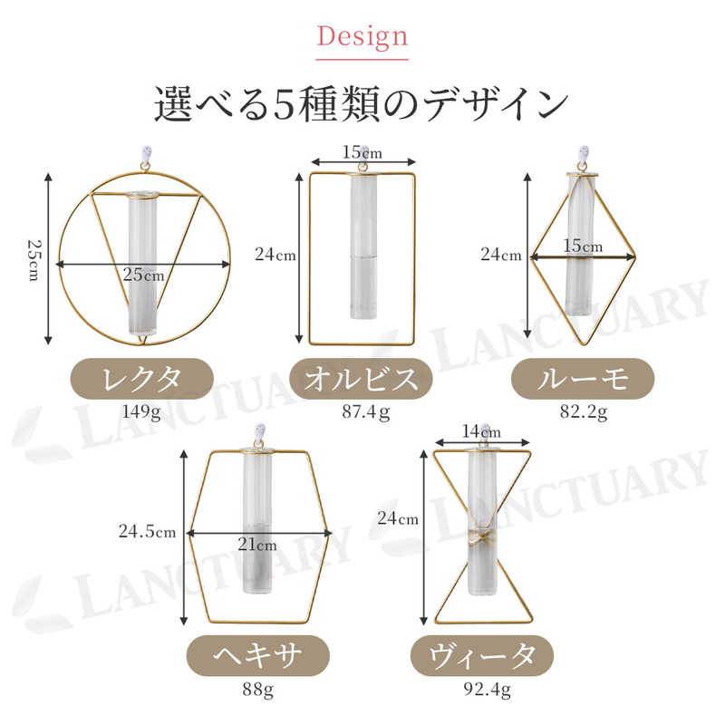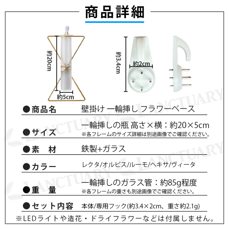 | 商品名: 壁掛け一輪挿し フラワーベース 種類: レクタ、オルビス、ルーモ、ヘキサ、ヴィータ サイズ: ガラス管: 高さ 約20cm × 横 約5cm。各フレーム:レクタ:約25cm×25cm、オルビス:約24cm×15cm、ルーモ:約24cm×15cm、ヘキサ:約24.5cm×21cm、ヴィータ:約24cm×14cm 重さ: ガラス管: 約85g程度。各フレーム:レクタ:約149g、オルビス:約87.4g、ルーモ:約82.2g、ヘキサ:約88g、ヴィータ:約92.4g 素材: 鉄製、ガラス 付属品: 専用フック (約3.4cm × 2cm、重さ約2.1g) 注意点: LEDライト、造花、ドライフラワーは付属しておりません。 |