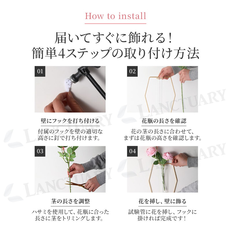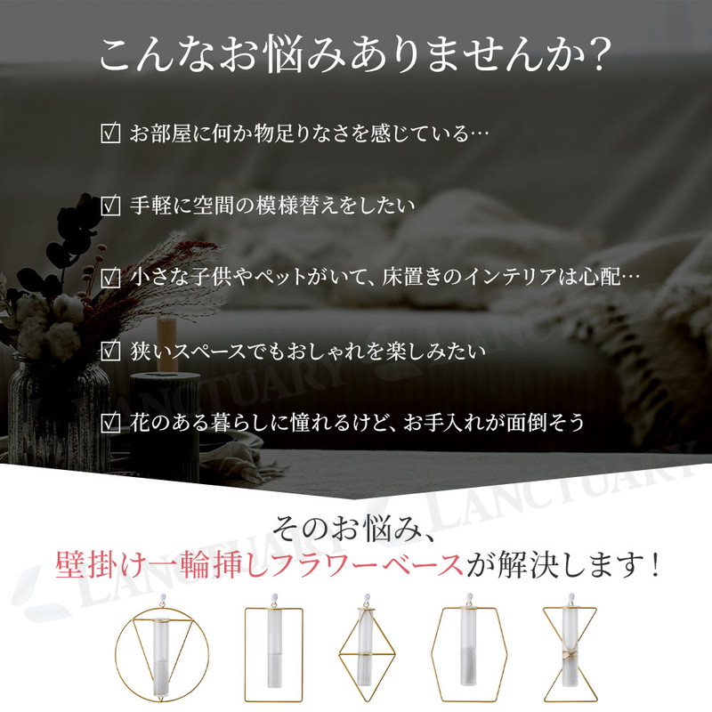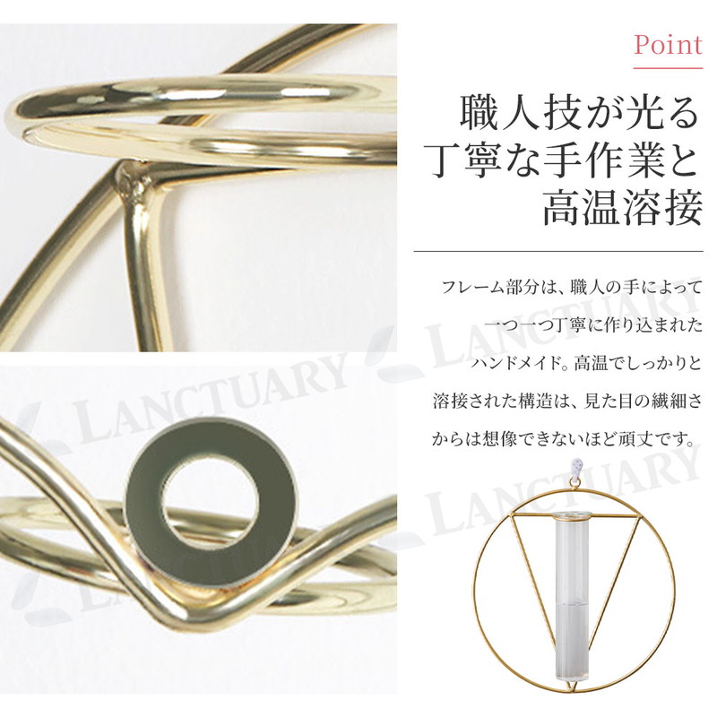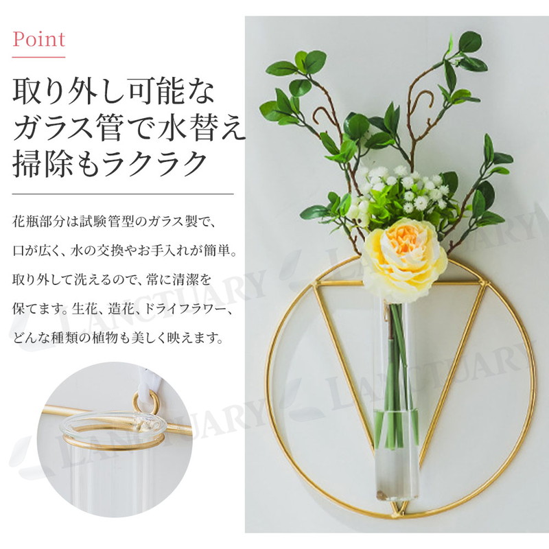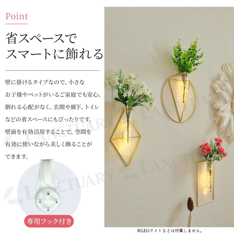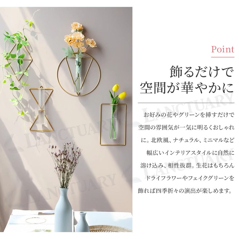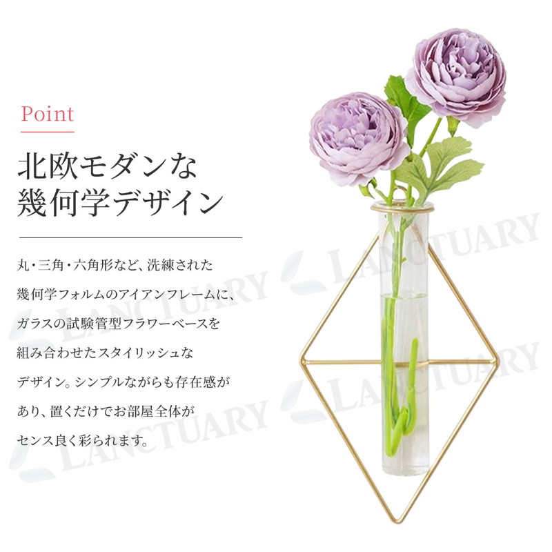 | この壁掛け一輪挿しフラワーベースは、お部屋の雰囲気を手軽に一新するインテリアアイテムです。北欧風の洗練された幾何学デザインが特徴で、丸、三角、六角形など、シンプルながらも存在感のあるアイアンフレームに、透明なガラス製試験管が組み合わされています。リビングや玄関、書斎など、どんな空間にも自然に溶け込み、スタイリッシュなアクセントを加えます。お好みの生花はもちろん、ドライフラワーやフェイクグリーンを飾ることで、四季折々の表情を演出し、空間全体が華やかに変わります。壁に掛けるタイプなので、床置きの心配がなく、小さなお子様やペットがいるご家庭でも安心してお使いいただけます。また、省スペースで飾れるため、廊下やトイレなどの限られた空間でもおしゃれなディスプレイを楽しむことが可能です。壁面を有効活用することで、お部屋を広々と見せながら、美しいウォールギャラリーを作り出すことができます。取り付けも簡単な専用フックが付属しており、届いたその日からすぐに飾りつけを始められます。 |
