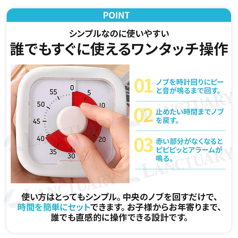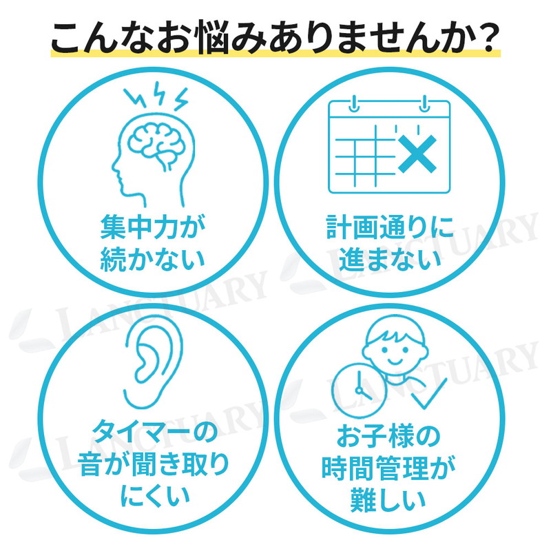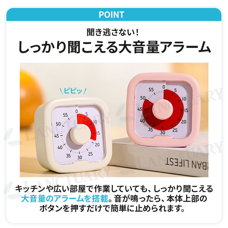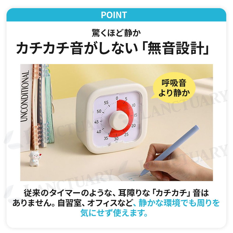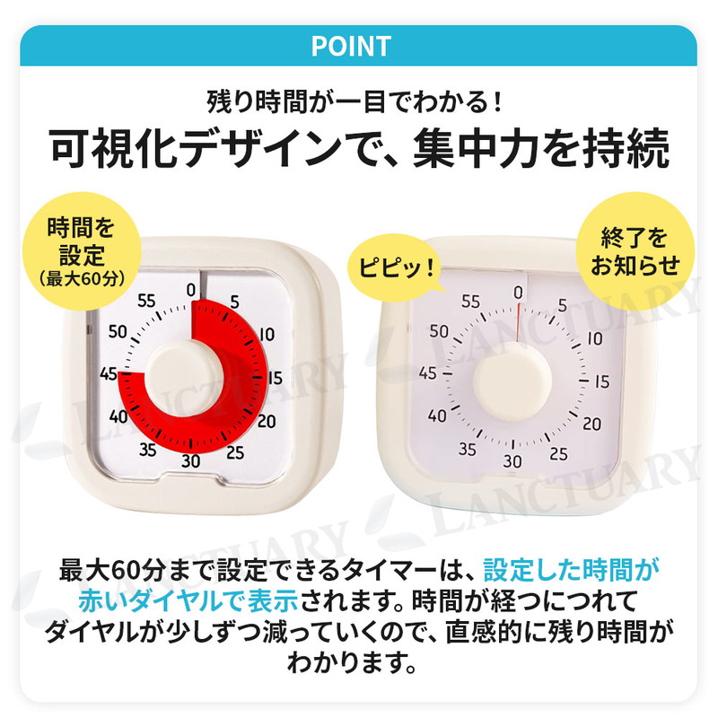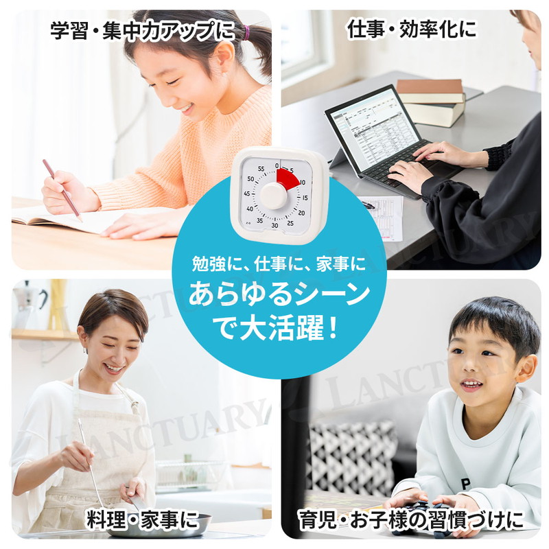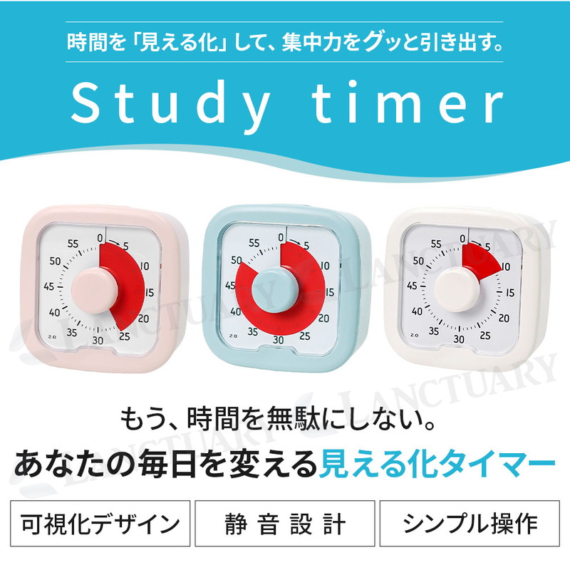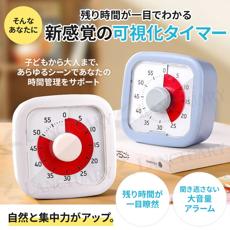 | この商品は、時間を視覚的に管理できる新しいタイプのスタディタイマーです。設定した時間が赤いダイヤルで表示され、時間の経過とともにダイヤルが減っていくので、残り時間が一目でわかります。この「見える化」の効果によって、あとどれくらい頑張ればよいか直感的に把握でき、自然と集中力を高めることができます。勉強やデスクワークの効率を上げたい方、集中力が長続きしないとお悩みの方に最適です。 静かな環境でも周りを気にせず使える無音設計も大きな特徴です。カチカチという耳障りな作動音がなく、自分の作業に没頭できます。その静けさは、呼吸音よりも静かだと言われるほどです。シンプルながらも洗練されたスクエアデザインは、どんな空間にも馴染み、インテリアの一部としても楽しめます。 学習や仕事の効率化はもちろん、日々の家事や育児にも役立ちます。鍋の煮込み時間を計ったり、お子様のゲーム時間を管理したり、様々なシーンで活躍します。小型で可愛らしいデザインは持ち運びにも便利で、気分に合わせて好きな場所で使えます。時間をより豊かに、そして計画的に過ごすための頼れるパートナーとしておすすめです。 |