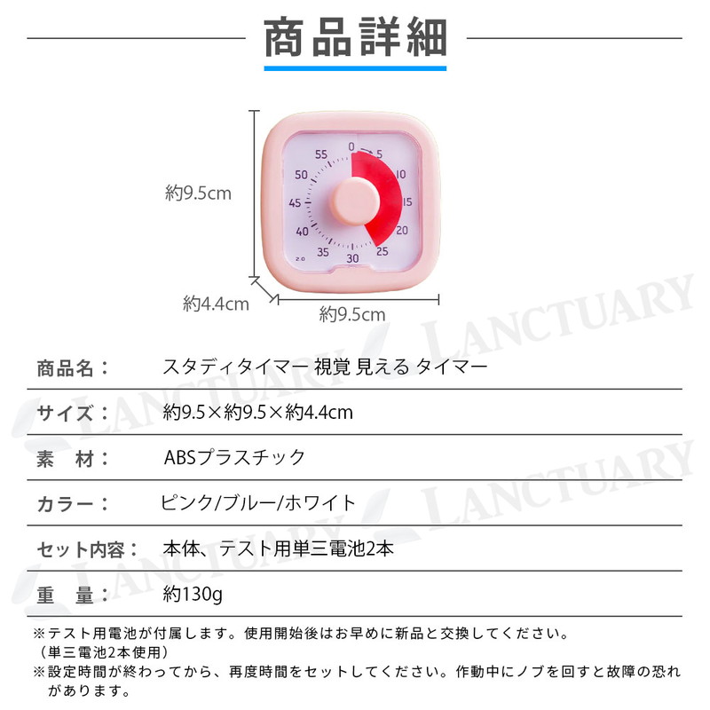 | 商品名:スタディタイマー 視覚 見える タイマー サイズ: 縦9.5cm × 横9.5cm × 奥行き4.4cm 重さ: 約130g 素材: ABSプラスチック カラー: ホワイト、ブルー、ピンク セット内容: 本体、テスト用単三電池2本 |
