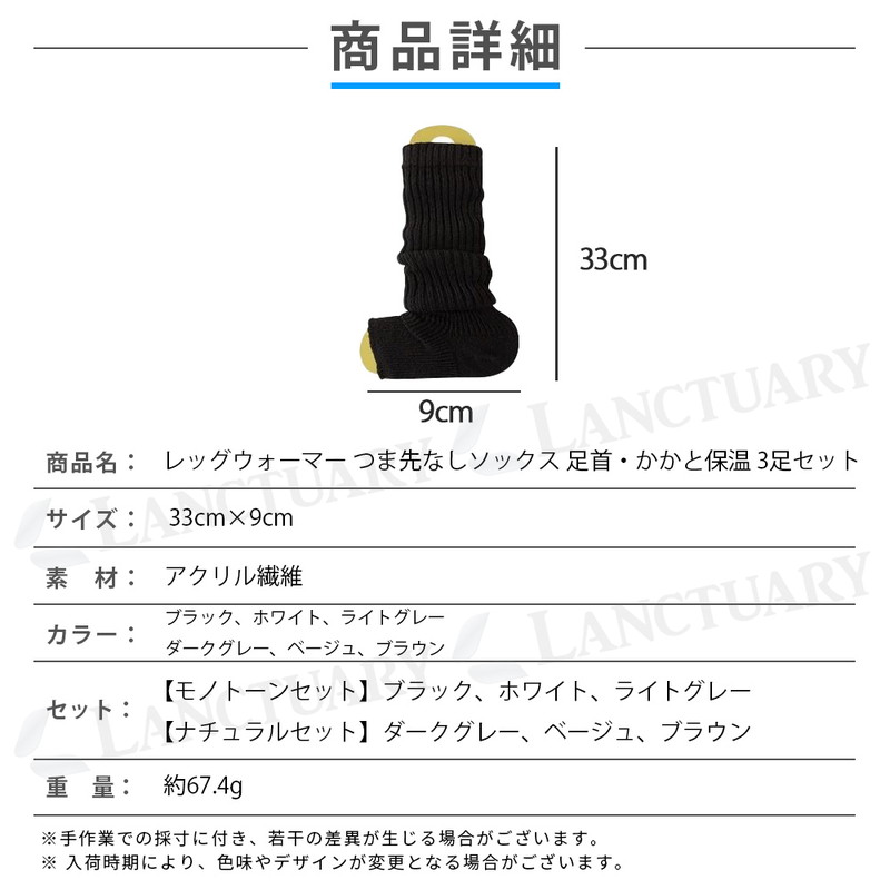 | 商品名:レッグウォーマー つま先なしソックス 足首・かかと保温 3足セット 素材:アクリル繊維 サイズ:33cm×9cm カラー:ブラック ホワイト ライトグレー ダークグレー ブラウン ベージュ 重量:67.4g セット内容:【モノトーンセット】ブラック ホワイト ライトグレー【ナチュラルセット】ダークグレー ブラウン ベージュ |