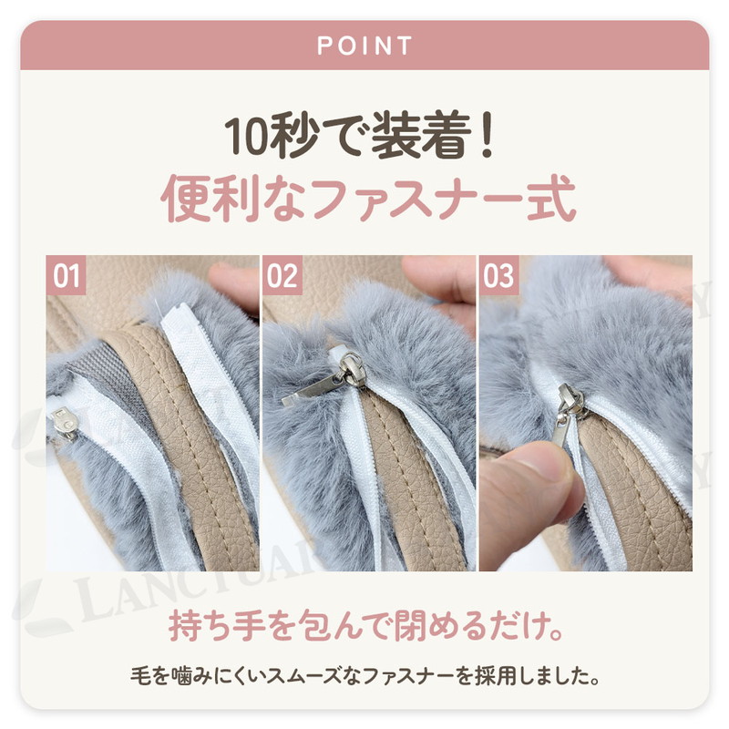 | 商品名:ファーハンドルカバー 2本セット サイズ:約29cm×6cm 重量:約51g(1本あたり) 素材:ポリエステル セット内容:同色2本セット |