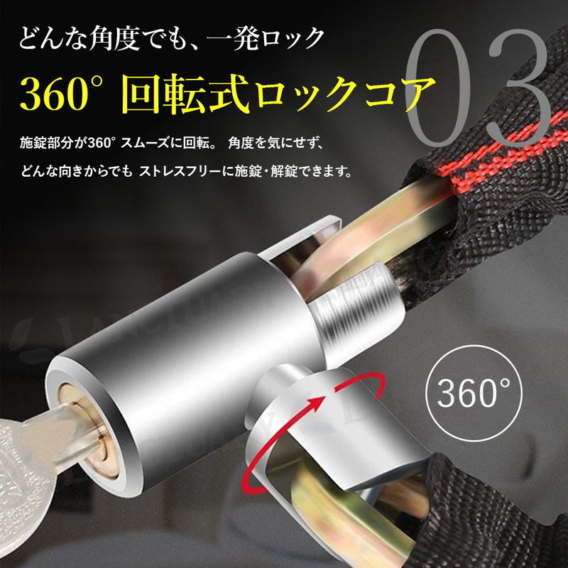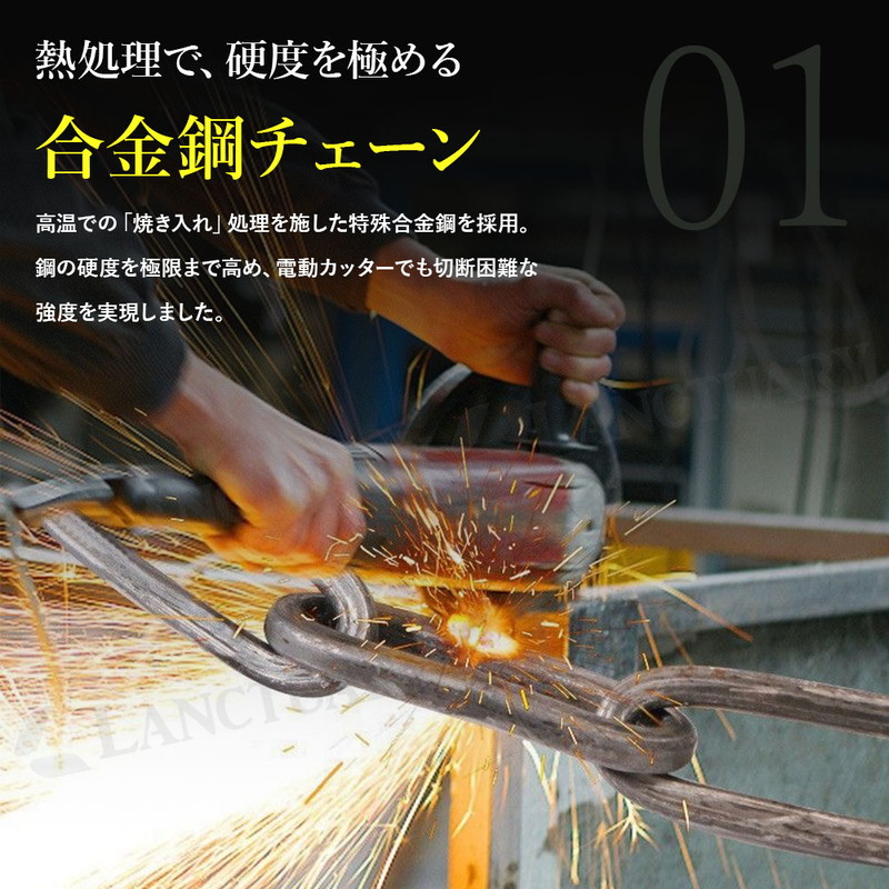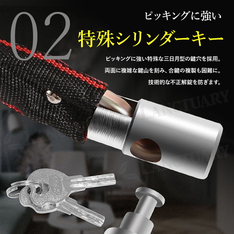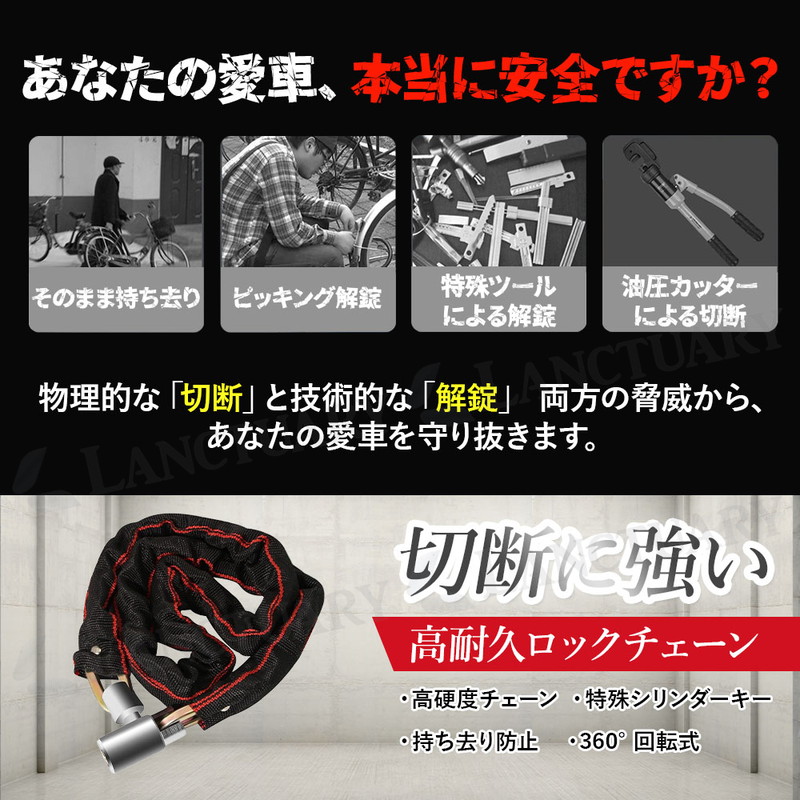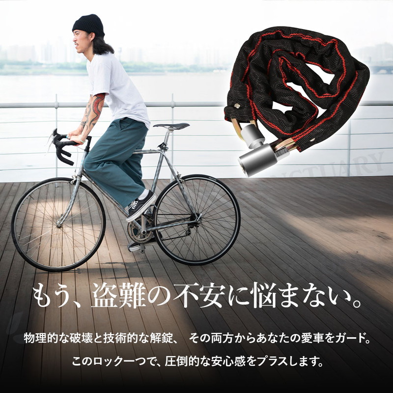 | 大切な自転車やバイクを盗難の不安から守るため、私たちは高剛性ロックチェーンを開発しました。 このロックの最大の特長は、プロの窃盗工具にも屈しない圧倒的な強度にあります。 チェーン部分には、高温での加熱と急速冷却を行う「焼き入れ」と呼ばれる熱処理を施した特殊合金鋼を採用。 これにより鋼の硬度を極限まで高めており、油圧カッターや電動カッターといった強力な工具でも容易には切断できません。 物理的な破壊から、あなたの大切な愛車を徹底的にガードします。 強さの秘密はチェーンだけではありません。 鍵の心臓部であるシリンダーには、ピッキングに強いとされる特殊な三日月型を採用しました。 さらに、鍵山は両面に複雑なパターンで刻まれており、合鍵の複製も非常に困難です。 切断という物理的な脅威だけでなく、技術的な不正解錠からも愛車を二重に守ります。 防犯性だけでなく、日々の使いやすさも追求しました。 施錠部分は360°スムーズに回転する構造のため、タイヤやフレームの角度を気にする必要がありません。 どんな向きからでもストレスフリーに施錠・解錠が行えます。 また、チェーン全体を厚手で丈夫な布製カバーで保護。 施錠時にガチャガチャと車体に当たっても、大切なフレームを傷つけることがありません。 長さは2種類からお選びいただけます。 扱いやすい100cm(Mサイズ)と、電柱やガードレールといった地面の固定物と車体を一緒にロックするのにも十分な120cm(Lサイズ)をご用意。 持ち去り盗難のリスクを大幅に軽減できます。 万が一の鍵の紛失に備えて、スペアキーを含む合計2本をお届けします。 ご自宅での保管用や、ご家族との共有にも便利です。 毎日の通勤・通学から、バイク、ご自宅の門扉の施錠まで。 このロック一つで、日々の暮らしに確かな安心感をプラスします。 |