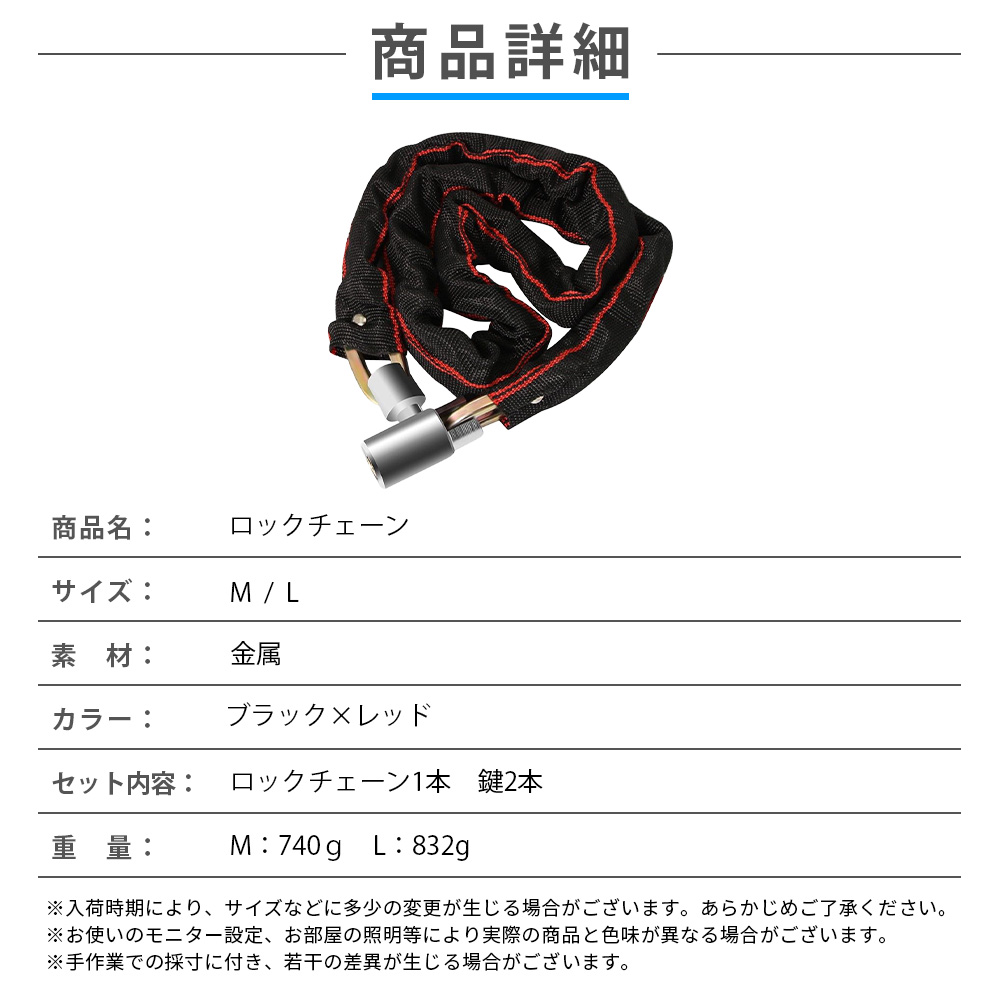 | 商品名:ロックチェーン 120cm 100cm サイズ/重量:Mサイズ(長さ 約100cm / 重さ 約740g)Lサイズ(長さ 約120cm / 重さ 約832g) 材質:金属 セット内容:ロック本体/鍵×2本 |