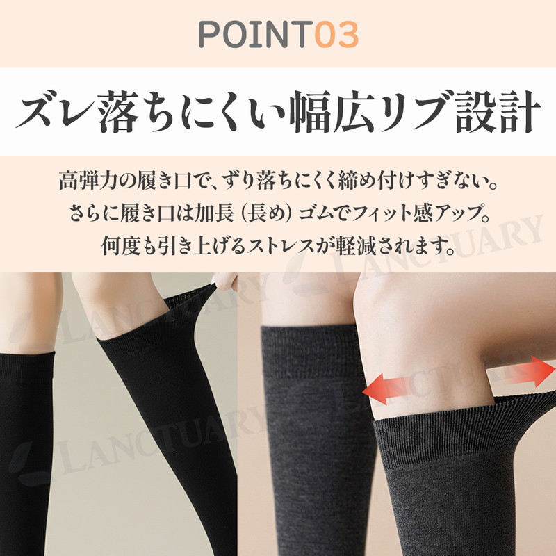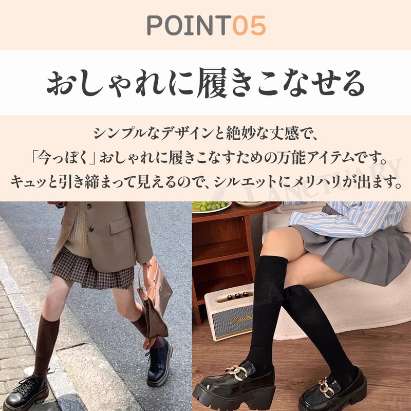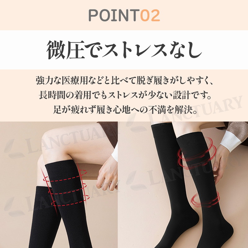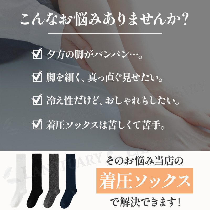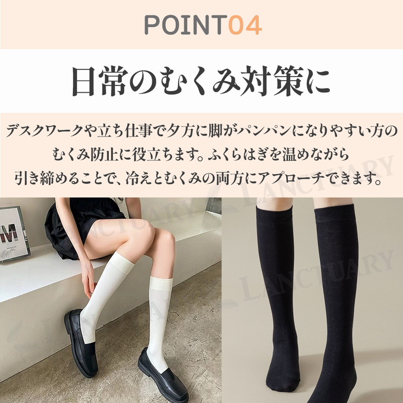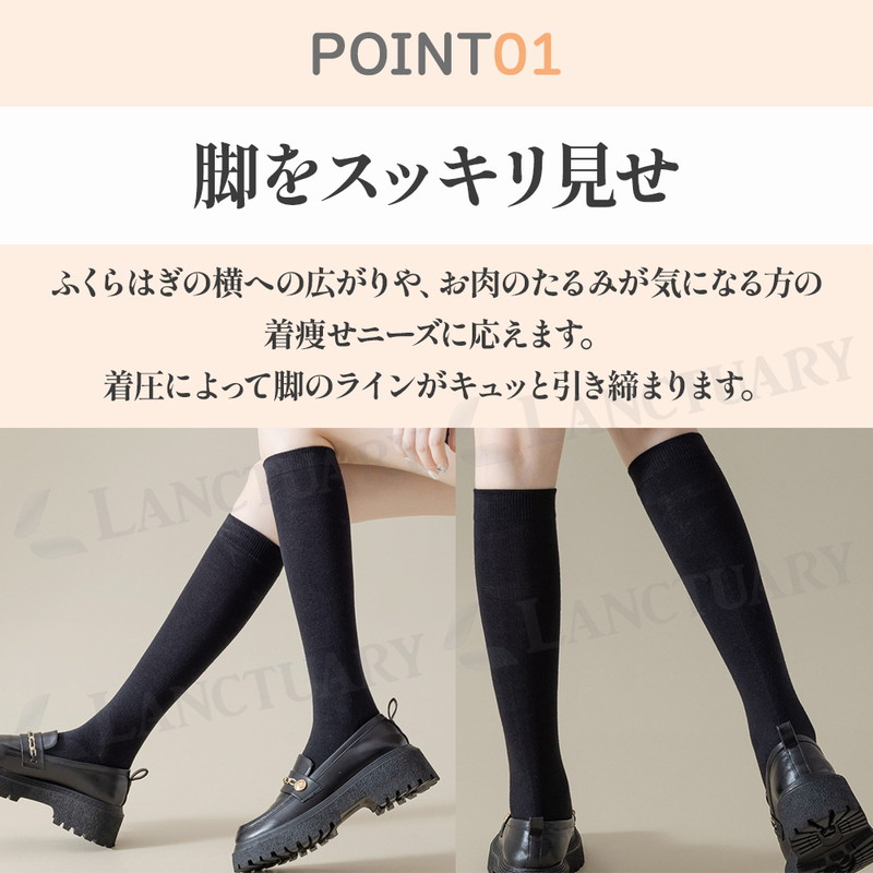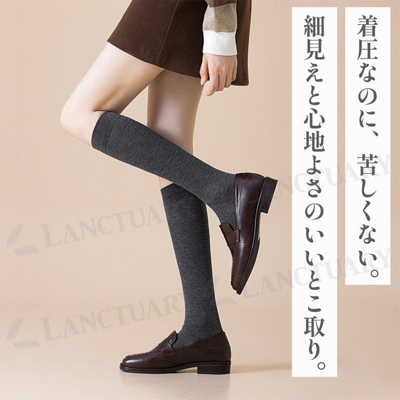 | 今日のコーデ、脚元から整える。 ブーツを脱いでも、自信あり。 美脚シルエットをキープする着圧ハイソックスが登場しました! この商品は医療用や強力な着圧ソックスとは違い、微圧に設計されています。 ぎゅうぎゅうに締め付けるのではなく、ふくらはぎを優しくホールドしてくれるような優しい安心感があります。 デスクワークや立ち仕事で、夕方になると靴がきつくなるようなむくみにも効果的です。 またふくらはぎの横への広がりや、お肉のたるみが気になる方の着痩せニーズにも応えてくれる万能アイテムです。 履き口は高弾力となっておりずれ落ちにくく、何度も引き上げるストレスも軽減。 今っぽくおしゃれに履きこなせるシンプルなデザインと絶妙な丈感。 ローファーやミニスカート、ロングスカートなど様々なコーデに合い、キュッと引き締まって見えるのでシルエットにメリハリがでます。 日常使いできるファッションアイテムとして大活躍! カラーはブラック、ホワイト、グレー、ネイビーと使いやすい4色です。 忙しい毎日の中で、履くだけで脚が軽くなり、鏡に映るシルエットに少し自信が持てる。 そんな小さな喜びが、一日を心地よく過ごすエッセンスになります。 着圧ソックス、ぜひこの機会にお試しください! |