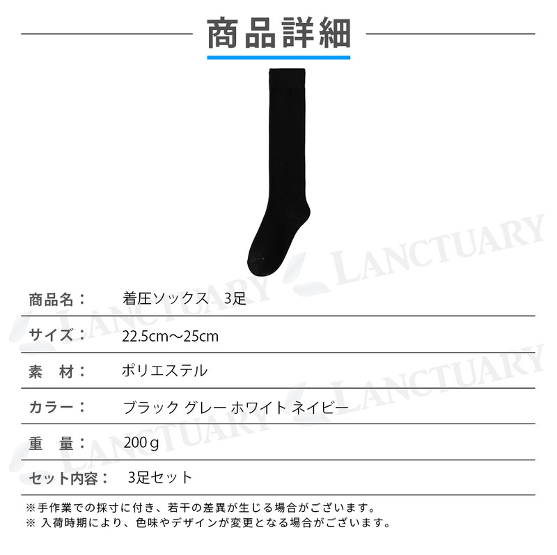 | 商品名:着圧ソックス ハイソックス 素材:ポリエステル サイズ:22.5cm〜25cm カラー:ブラック ホワイト グレー ネイビー セット内容:3足 ※お手入れ 常温で手洗い/長時間のつけ置きは避ける 中性洗剤推奨 水温は約40°Cまで目安 |