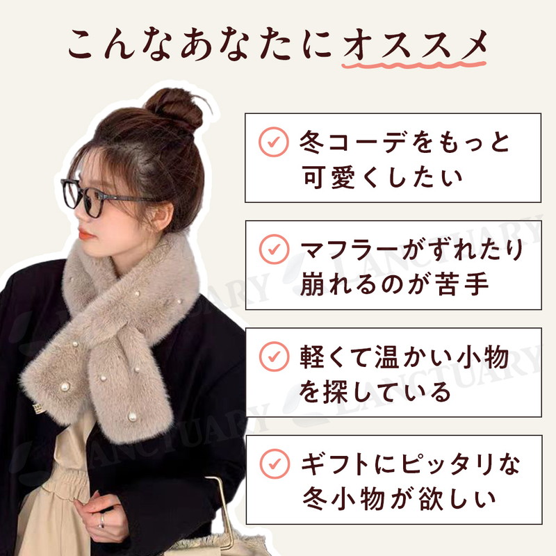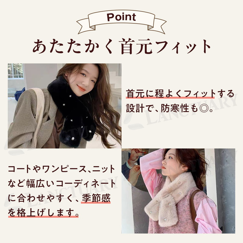 | ふんわりとしたフェイクファーを使用した、冬に欠かせないレディース防寒アイテム。肌に触れた瞬間からやさしいぬくもりを感じられ、見た目にもふわふわとした上品な質感が、いつものコーディネートをぐっと格上げしてくれます。甘すぎないデザインなので、大人可愛い雰囲気を演出しながら、きれいめスタイルにも自然になじみます。 差し込みタイプのティペット仕様で、巻き方に悩む必要はなし。さっと首元に通すだけで形が決まり、忙しい朝や外出先でもストレスなく着用できます。しっかりフィットしつつも締め付け感が少なく、ネックウォーマー感覚で使えるのも魅力。軽量設計のため、長時間身につけても疲れにくく、通勤やお出かけにもぴったりです。 上品なパール装飾がさりげないアクセントとなり、シンプルなコートやニット、ワンピースにも好相性。防寒性とデザイン性を両立した一枚で、冬のおしゃれを楽しめます。デイリー使いはもちろん、特別な日の装いにも活躍する万能アイテムです。 冬のプレゼントやギフトとしても喜ばれるデザインで、大切な方への贈り物にもおすすめ。フェイクファーならではの扱いやすさと、洗練された印象を兼ね備えたマフラーで、寒い季節を快適かつ上品にお過ごしください。 |