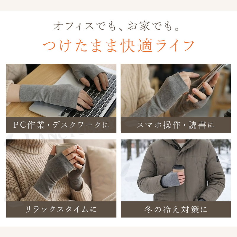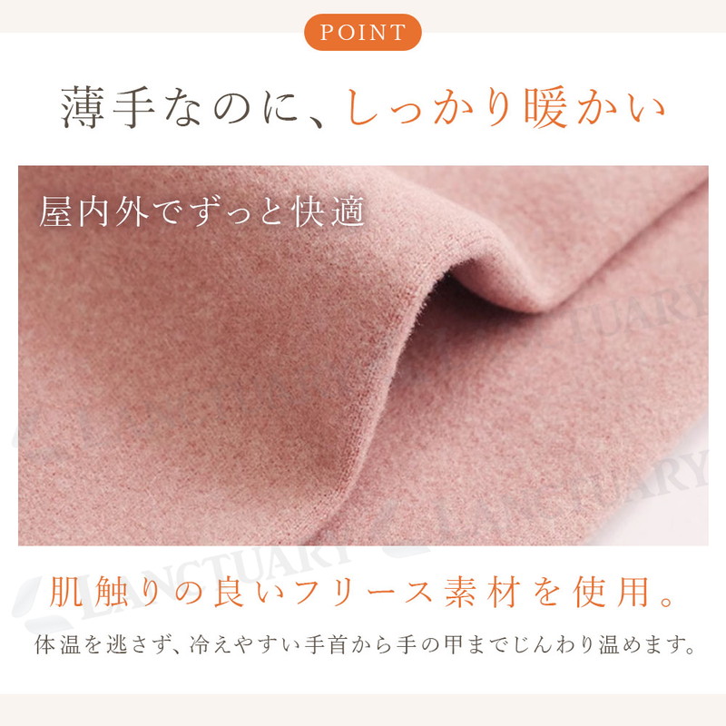 | 寒い季節になると、オフィスでのデスクワークや自宅でのリラックスタイムに手先の冷えが気になることはありませんか。かといって分厚い手袋をしてしまうと、キーボードが打ちづらかったりスマートフォンの操作ができなかったりと、何かと不便なものです。そんな冬の悩みを解消するのが、この薄手フリース素材のハンドウォーマーです。 最大の特徴は、指先が自由に使えるフィンガーレス仕様であること。着用したままパソコン作業やスマホのタッチパネル操作がストレスなく行えます。読書や細かい手作業、家事の際にもいちいち外す手間がありません。 素材には、薄手ながらも保温性に優れたフリースを採用しました。肌触りはなめらかで、冷えやすい手首から手の甲にかけてじんわりと包み込むように温めます。ごわつきにくいので、長時間の着用でも快適に過ごせるでしょう。 また、毎日使うものだからこそ耐久性にもこだわりました。表面は摩擦に強く、気になる毛玉ができにくい加工が施されているため、きれいな状態が長持ちします。伸縮性も抜群で、手の動きに合わせて柔軟にフィット。締め付け感の少ないやさしい着け心地は、女性だけでなく男性にもお使いいただけるユニセックス設計です。 カラーは、どんな服装にも合わせやすい落ち着いたナチュラルな4色をご用意しました。ご家族やパートナーと色違いで揃えたり、ちょっとした冬のギフトとしても喜ばれるアイテムです。屋内外を問わず、冷え対策と利便性を両立したこのハンドウォーマーで、冬の毎日をより快適にお過ごしください。 |