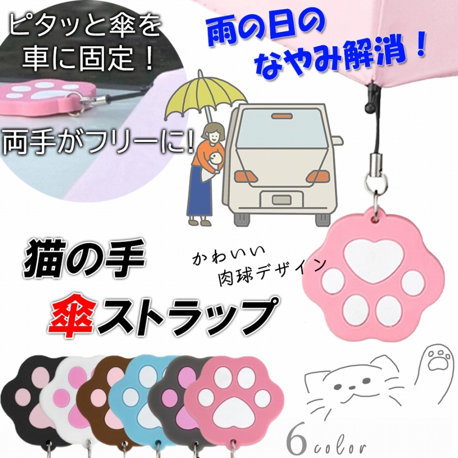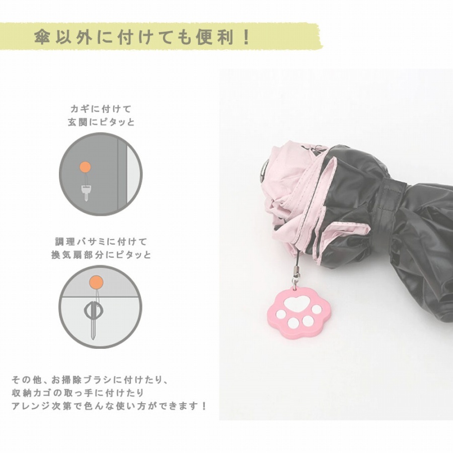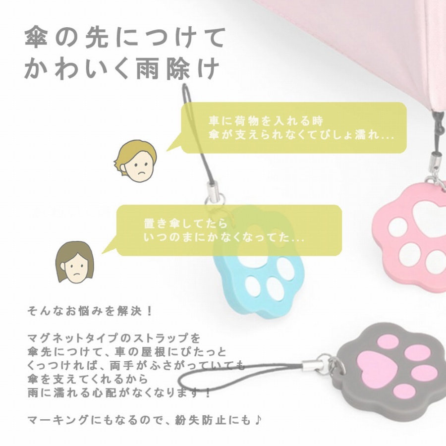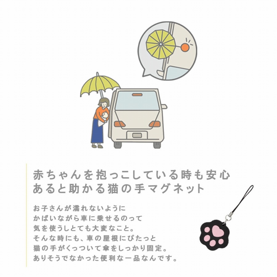 | 商品の説明 | 傘の先につけてかわいく雨除けできるストラップ。 マグネットタイプのストラップを傘先につけて、 車の屋根にぴたっとくっつければ、両手がふさがっていても 傘を支えてくれるから雨に濡れる心配がなくなります! マーキングにもなるので、紛失防止にもGood 赤ちゃんを抱っこしている時も安心あると助かる猫の手マグネット。 お子さんが濡れないようにかばいながら車に乗せるのって気を使うしとても大変なこと。 そんな時にも、車の屋根にぴたっと猫の手がくっついて傘をしっかり固定。 ありそうでなかった便利な一品なんです。 憂鬱な雨の日の保育園の送り迎え、たくさんの荷物を持つお買い物 肉球ストラップが大活躍します! シンプルにかわいいので、傘だけでなくバッグに付けるアクセサリーや キーホルダーとしてもオススメですよ! |