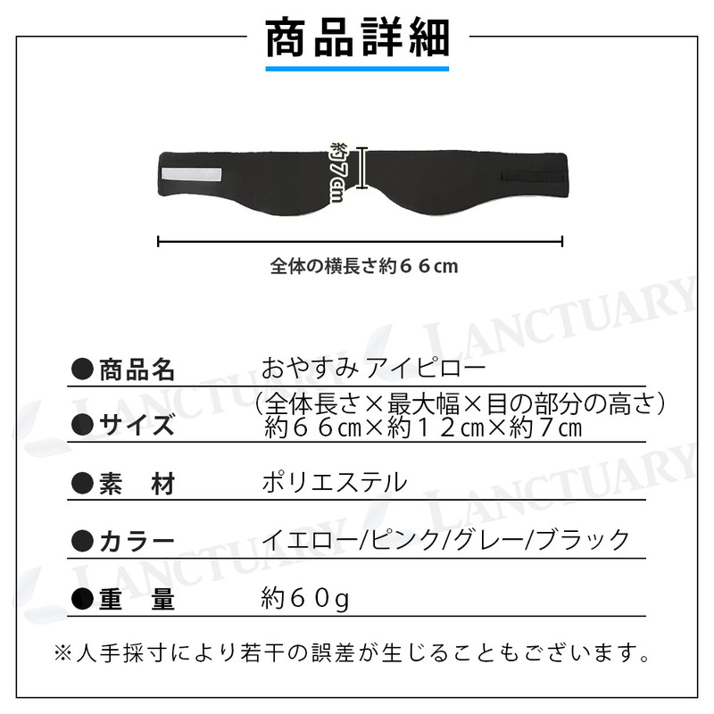 | 商品名:おやすみ アイピロー カラー:ブラックイエローグレーピンク 材質:ポリエステル サイズ(約): 66cm×12cm×7cm (全体長さ×最大幅×目の部分の高さ) 重さ(約):60g |