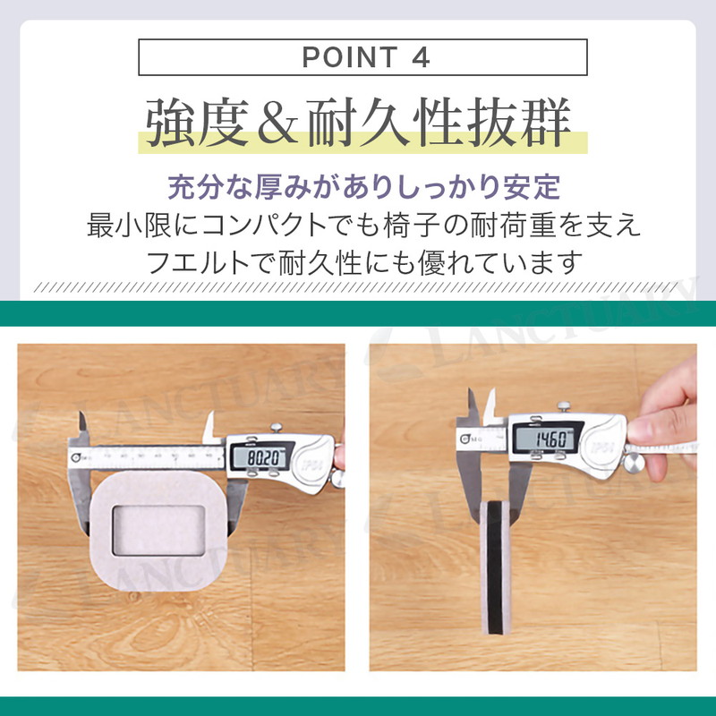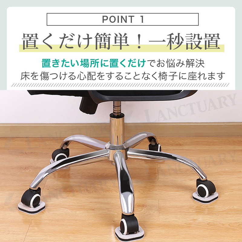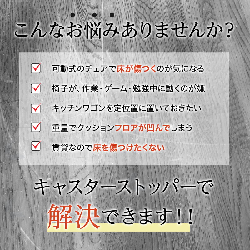 | キャスター付きの椅子や家具が、気づかないうちに少しずつ動いてしまう、床やフローリングが傷ついてしまう事ありますよね。 そんな小さなストレスを解消するのがキャスターストッパー。工具も接着剤も不要、置くだけで簡単に設置できる便利アイテム。 こちらは使い勝手の良い5個セットで、ダイニングチェアやデスクチェアなど、複数の椅子にまとめてご使用いただけます。 底面にはフェルト素材を採用しているため、床への傷や摩擦音を軽減しながらキャスターをしっかり固定。 椅子に座ったときの安定感が増し、不要な移動を防止できます。特にフローリングやタイルなど滑りやすい床材のお部屋で効果を発揮。 小さなお子様やご高齢の方が使用する椅子にも安心です。 設置方法はとても簡単でストッパーを床に置き、その上にキャスターを乗せるだけ。滑り止め効果により、椅子が動きにくくなり、安定した座り心地を実現します。 掃除や模様替えで移動したいときは、持ち上げて外すだけなので後処理もラクラク。賃貸住宅でも床を傷つけずに安心して使えるのもポイントです。 また、落ち着いた色合いとシンプルなデザインで、どんなインテリアにも自然に馴染みます。 |