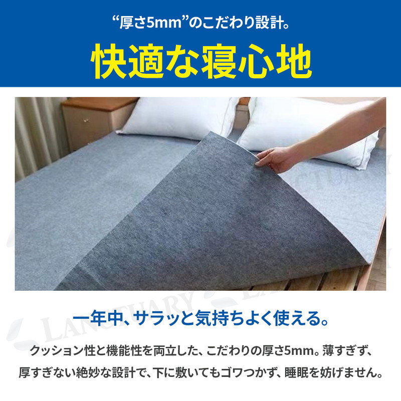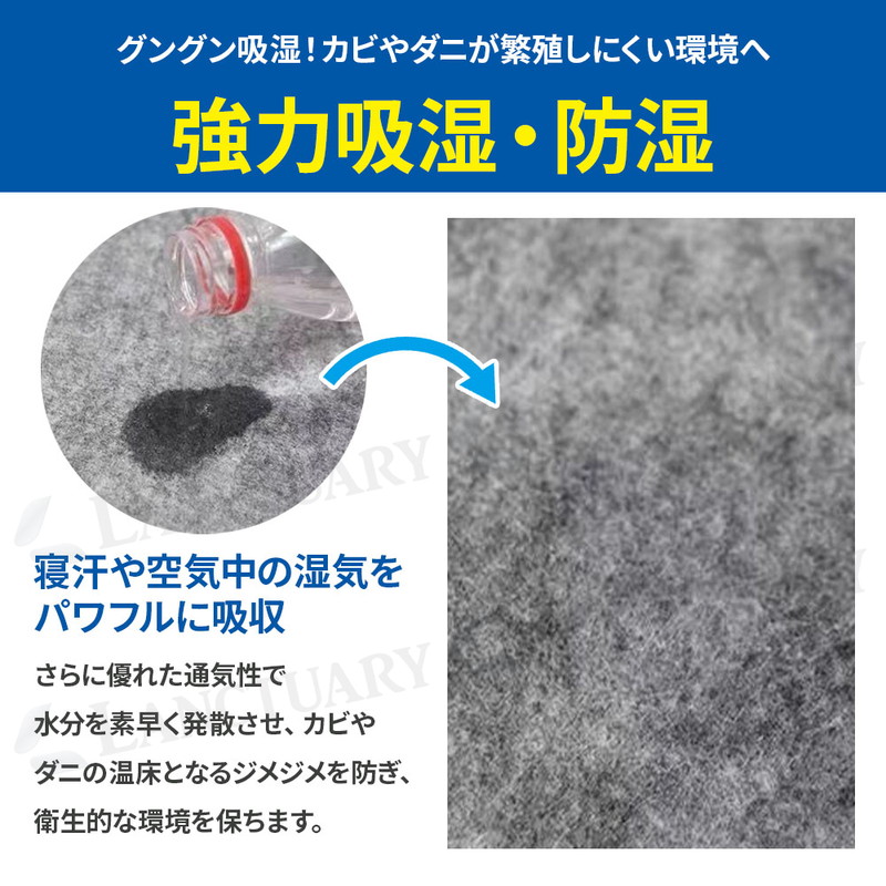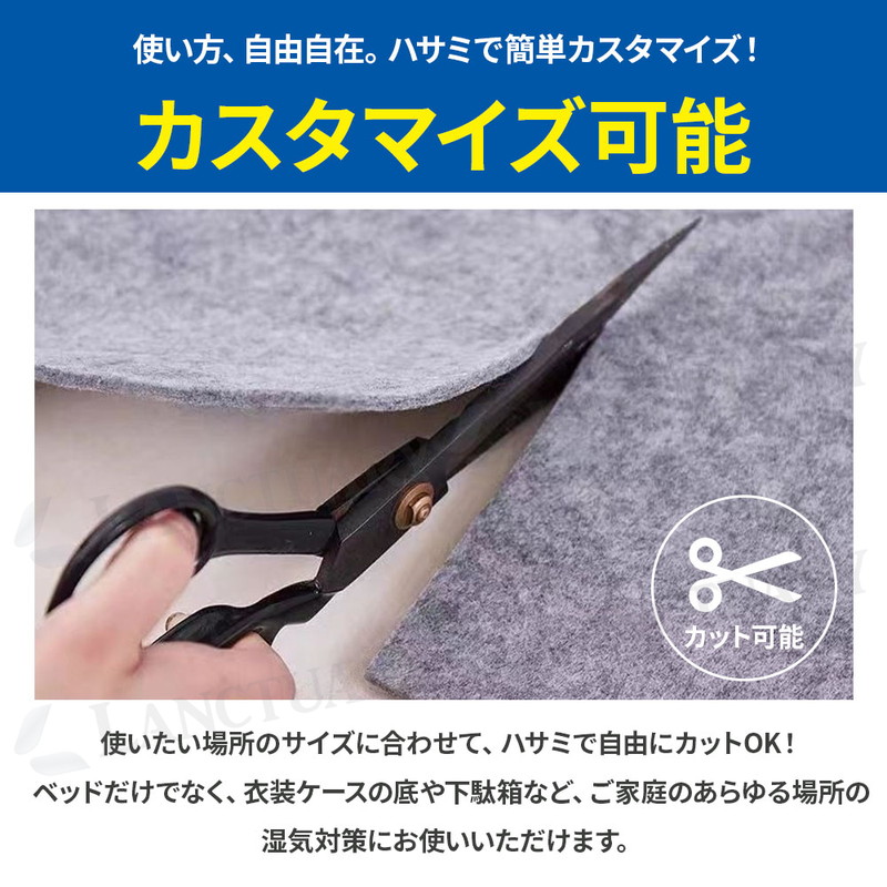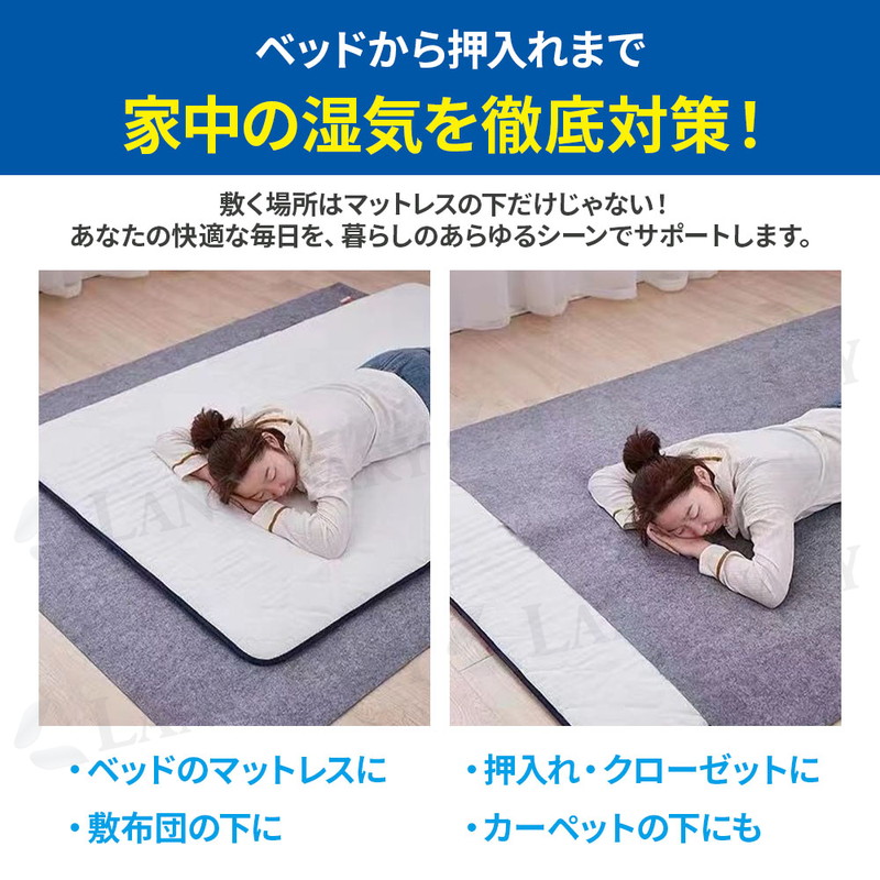 | 朝、目覚めた時の寝具のジメジメ感、気になりませんか。その不快感は、私たちが眠っている間に放出する汗や、季節による部屋の湿気が原因かもしれません。湿気はカビやダニの温床となり、快適な睡眠を妨げるだけでなく、健康面への影響も心配です。 この除湿シートは、そんな日々の悩みに応えるために開発されました。シート内部に含まれる特殊な繊維が、寝具にこもった湿気や寝汗をパワフルに吸収し、サラリとした快適な状態を保ちます。通気性にも優れているため、吸収した水分を効率よく発散させ、カビやダニが繁殖しにくいクリーンな環境づくりをサポートします。 厚さはこだわりの約5mm。薄すぎず厚すぎない絶妙な設計で、マットレスや敷布団の下に敷いてもゴワつきや違和感が少なく、普段の寝心地を損なうことはありません。季節を問わず一年中お使いいただける、オールシーズン対応仕様です。 お手入れが簡単なのも大きな特徴です。定期的に天日干しをしていただくだけで、吸収した湿気を放出し、吸湿パワーが回復します。繰り返しご使用いただけるため、使い捨ての除湿剤に比べて環境にやさしく、お財布にも嬉しい経済的なアイテムです。 ベッドのマットレスや敷布団の下はもちろん、ハサミでお好みのサイズにカットして、押入れやクローゼット、カーペットの下など、家中の気になる場所でお使いいただけます。この一枚で、湿気に悩まされない快適な毎日をお過ごしください。 |