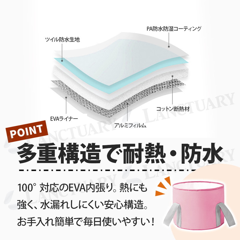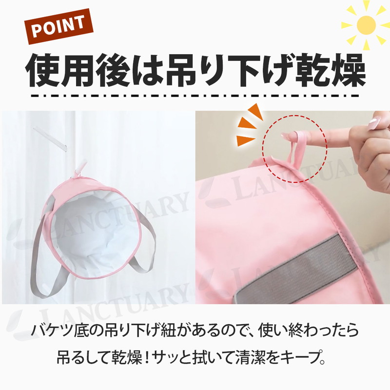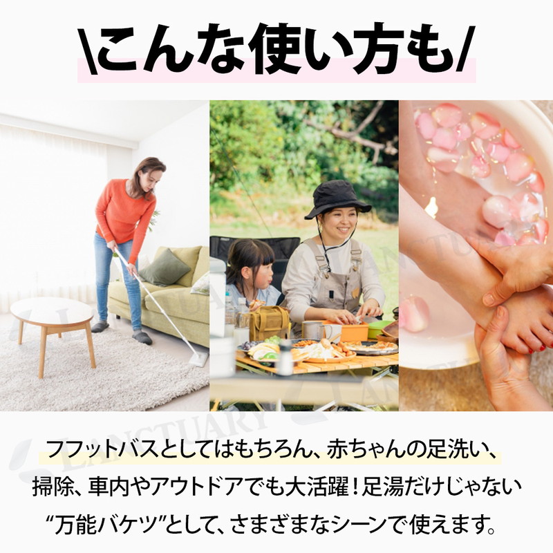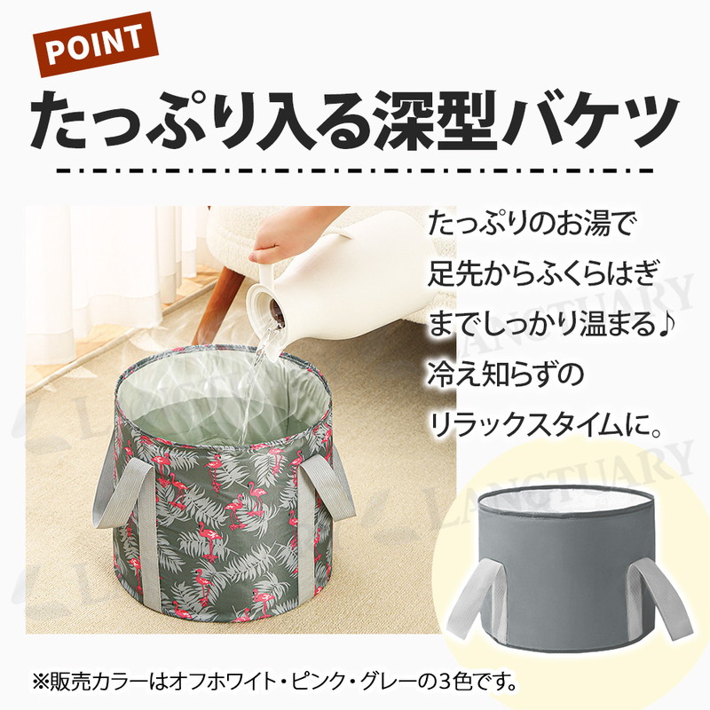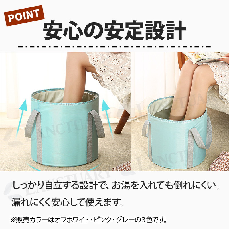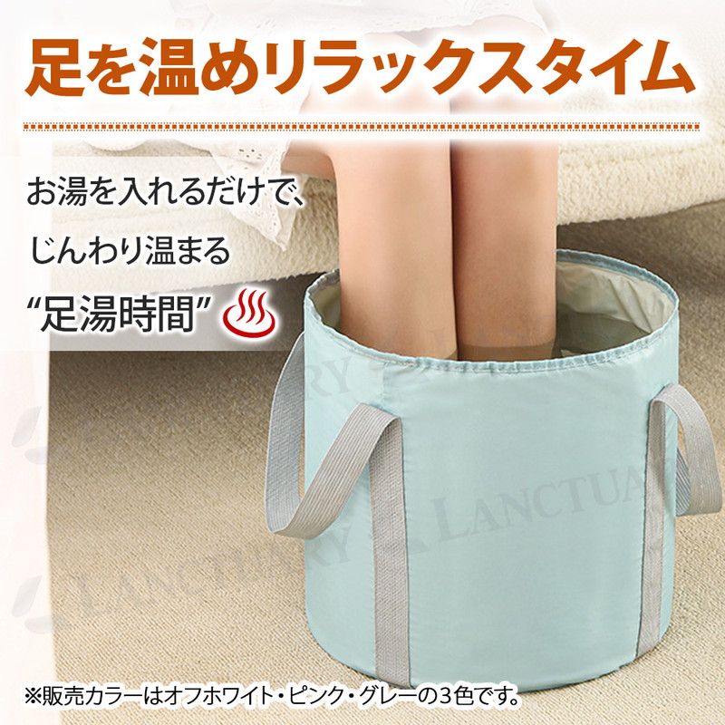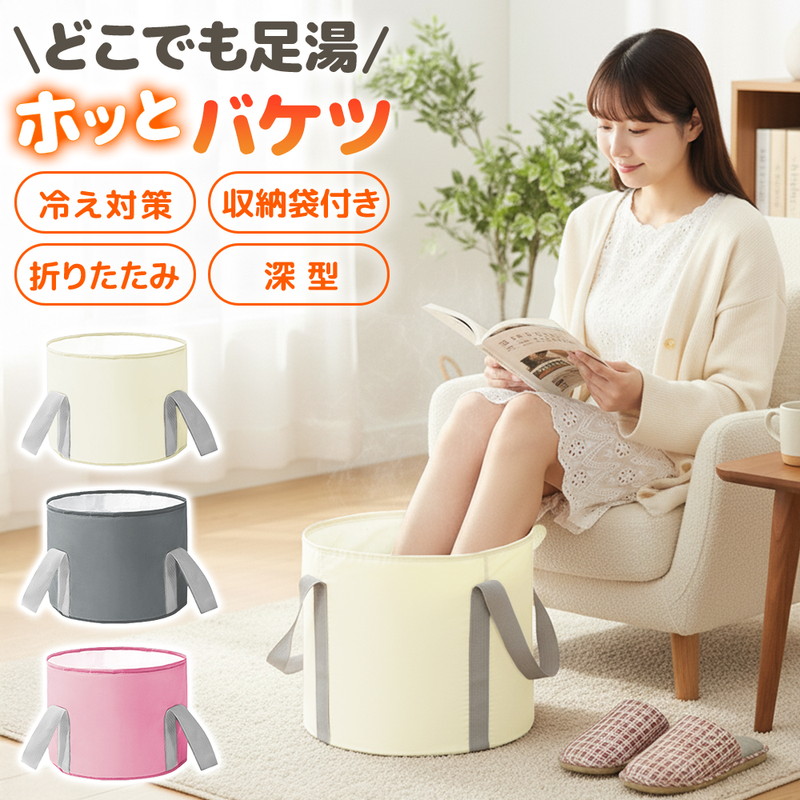 | これからの季節の冷え対策や長時間の外出で足が疲労している時などにおすすめです。 自宅で簡単にできるフットケア。リラックスタイムをより快適にできる足湯バケツが登場しました! 足湯バケツは自宅で温泉気分を味わいながらフットケアができます。 使い方は簡単でバケツにお湯を入れ、足を温めるだけ。 深型バケツで足裏や足首をしっかり温めてくれ、次第に体もぽかぽかに◎ 硬めの側面、補強テープで自立性が高く、お湯を入れてもぐらつかず安心してご使用いただけます。 また100°対応のEVAなど多重構造でしっかり耐熱、防水。 お手入れも簡単でサッと拭くだけでOKです。 両サイドに持ち運びに便利な取っ手がついているのでお湯を入れて運ぶ時や、使用後にお湯を捨てる時など持ち手を持って移動可能です。 バケツの底に吊り下げ紐があり使用後はサッと拭いて吊り下げ乾燥ができます。 バケツは簡単に折りたためるので小さくコンパクトに! 収納袋もついているので収納時や持ち運び時も便利です。 足湯以外にもフットバス、お掃除、アウトドア、介護など多用途でご使用いただけます。 普通のバケツだと持ち運びに場所を取りますが、コンパクトになるので外出先でもおすすめです。 あると便利な足湯バケツ、この機会にぜひお試しください! |