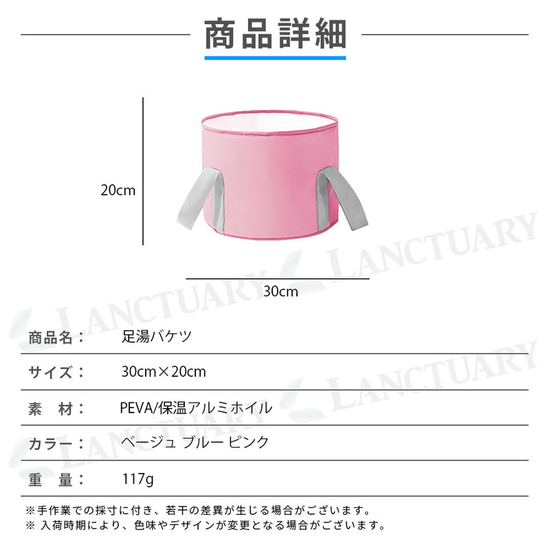 | 商品名:足湯バケツ 素材:PEVA/保温アルミホイル サイズ:幅30cm×高さ20cm カラー:ベージュ ピンク ブルー 重量:117g |