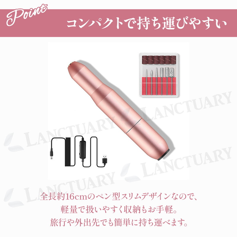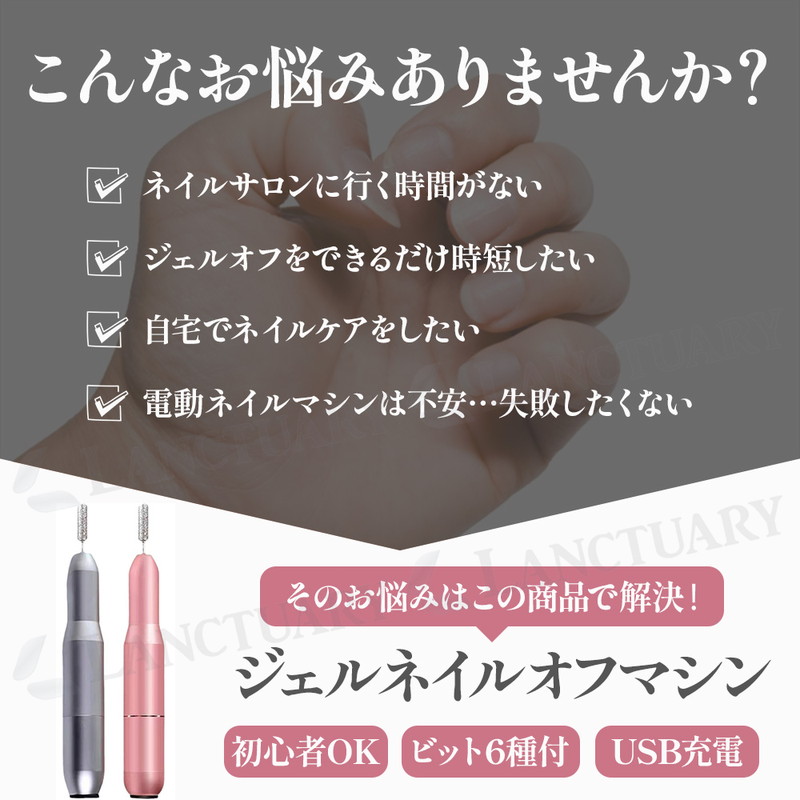 | ジェルネイルオフの時短を実現。 初心者から上級者まで! 1台3役で全てのネイルケアが可能な自宅でできるジェルネイルオフが登場しました! この商品はネイルオフ、形を整える、角質や甘皮ケアのすべてが可能。 6種類の付け替えビットが付属しており、爪の表面から細かいキワまで、プロのような仕上がりを自宅で再現できます。 高スペックな回転数と静音性で硬いジェルネイルもスピーディーに削れ、それでいて振動、騒音が少なく自宅で使いやすい仕様となっています。 回転速度は調整可能なのでスピーディーに行いたいオフから、ゆっくり丁寧に行いたい甘皮ケアまで幅広く対応できる設計となっています。 約16cmとコンパクトで手にフィットするペン型デザインなのでスリムで軽量。 持ち運びにも便利で収納にも場所をとりません。 充電はUSB方式のためパソコンのUSBポートやモバイルバッテリー、 スマートフォンのアダプターなどから手軽に電源を取ることができます。 いつでもどこでも好きな場所でネイルケアが可能です。 時間は自由に、指先は綺麗贅沢に!サロン超えの満足感を、これ一台で。 自宅でできるネイルケアマシーン、ぜひこの機会にお試しください! |