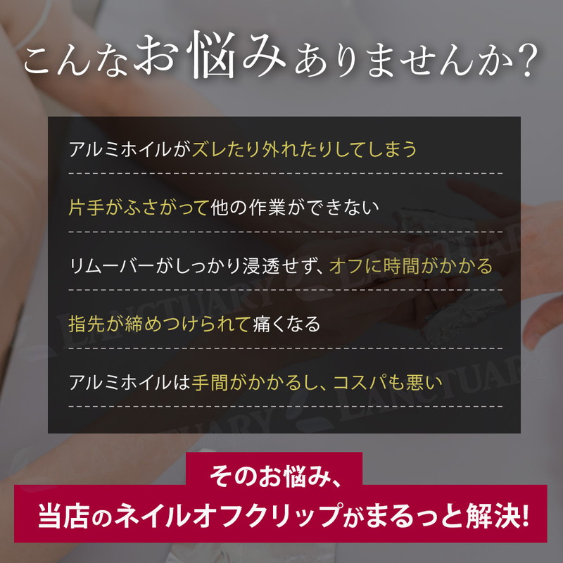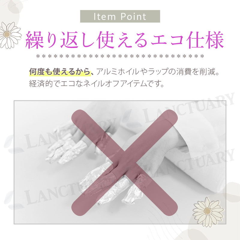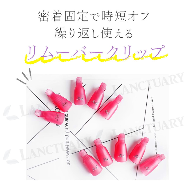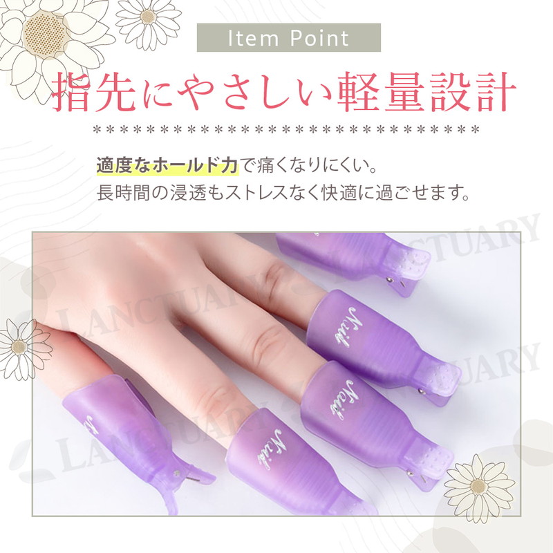 | ジェルネイルのオフをもっと手軽に、もっと快適に。ソークオフクリップは、リムーバーを含ませたコットンを挟むだけでしっかり固定できる、便利なネイルオフアイテムです。クリップ方式なので装着が簡単で、アルミホイルのようにズレたり巻き直したりする手間がありません。両手に装着したままスマホ操作や軽い作業もできるため、待ち時間のストレスがぐっと軽減します。 内側には滑り止め加工が施され、さらにバネ構造でしっかり密着。ジェル・シェラック・アクリルなど幅広いネイルに対応し、効率よくリムーバーを浸透させることでオフ時間を短縮できます。適度なホールド力で指先が痛くなりにくく、軽量設計だから長時間の浸透でも快適に使用できます。 繰り返し使える耐久仕様で、アルミホイルやラップを消費せずエコ。サロンワークにもセルフネイルにも使いやすい10個入りで、両手同時にオフできるのが嬉しいポイントです。カラーはブラック・レッド・ホワイト・ピンク・パープルの5色から選べ、用途や好みに合わせて揃えることができます。 面倒なネイルオフを、もっと簡単・快適にしたい方に。ソークオフクリップで、自宅でもサロン級のオフタイムを実現してください。 |