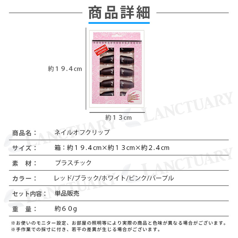 | 商品名 ネイルオフクリップ サイズ 19.4センチ×13センチ×2.4センチ 素材 プラスチック カラー ブラック レッド ホワイト ピンク パープル セット内容 単品(10個入り) 重量 約60グラム |